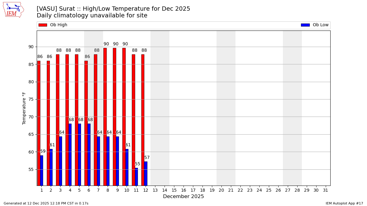 Description: This chart of the monthly temperature data. The bars are the observations and the dots are climatology.