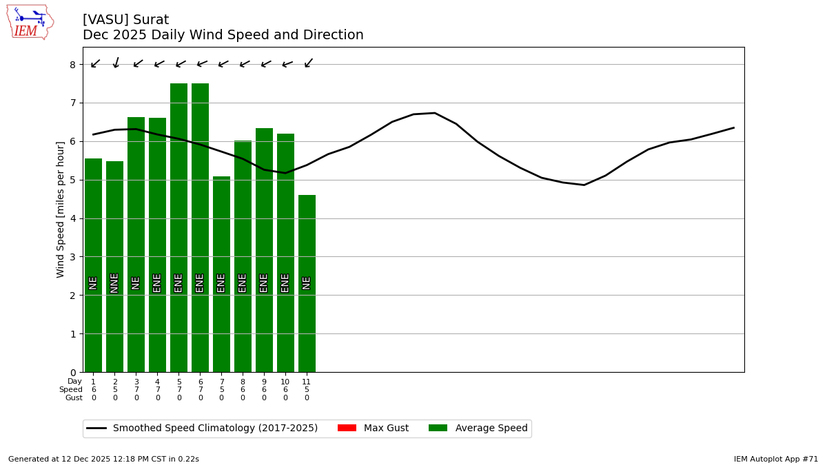 Description: This chart is of daily precipitation for the month. The red line would be an average month while the blue line and bars are observations.