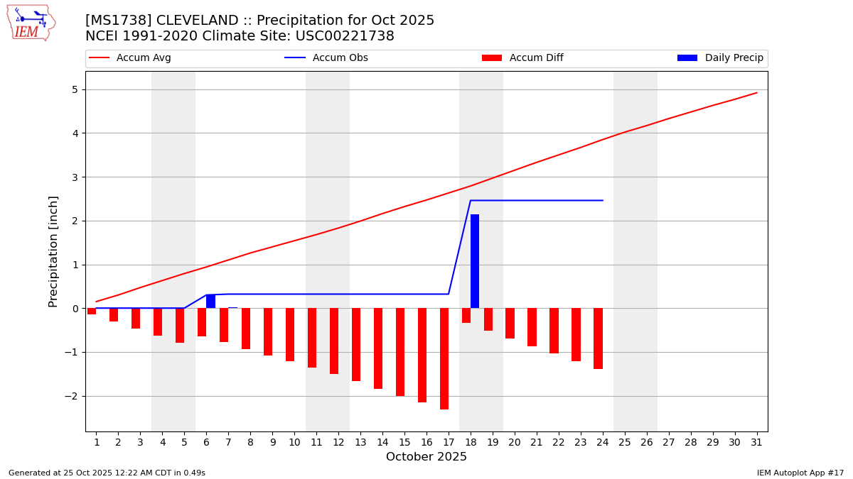Description: This chart is of daily precipitation for the month. The red line would be an average month while the blue line and bars are observations.
