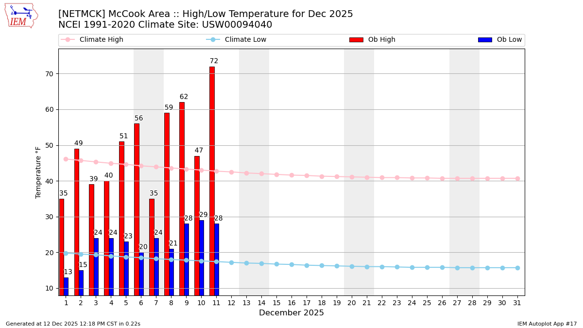 Description: This chart of the monthly temperature data. The bars are the observations and the dots are climatology.