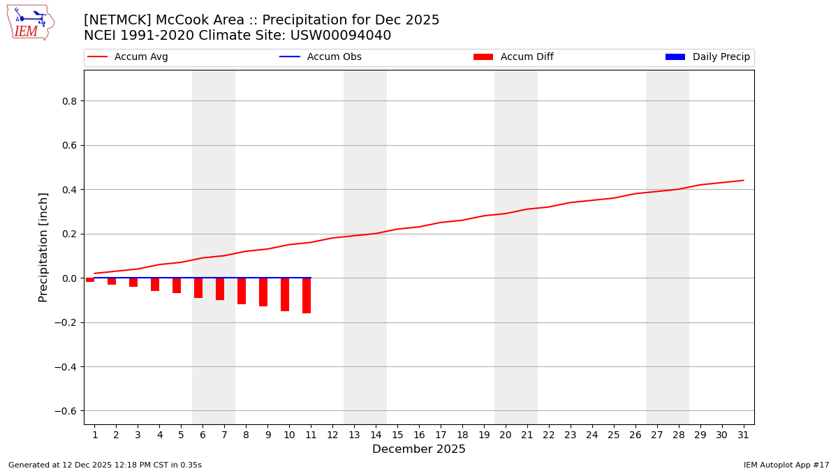 Description: This chart is of daily precipitation for the month. The red line would be an average month while the blue line and bars are observations.