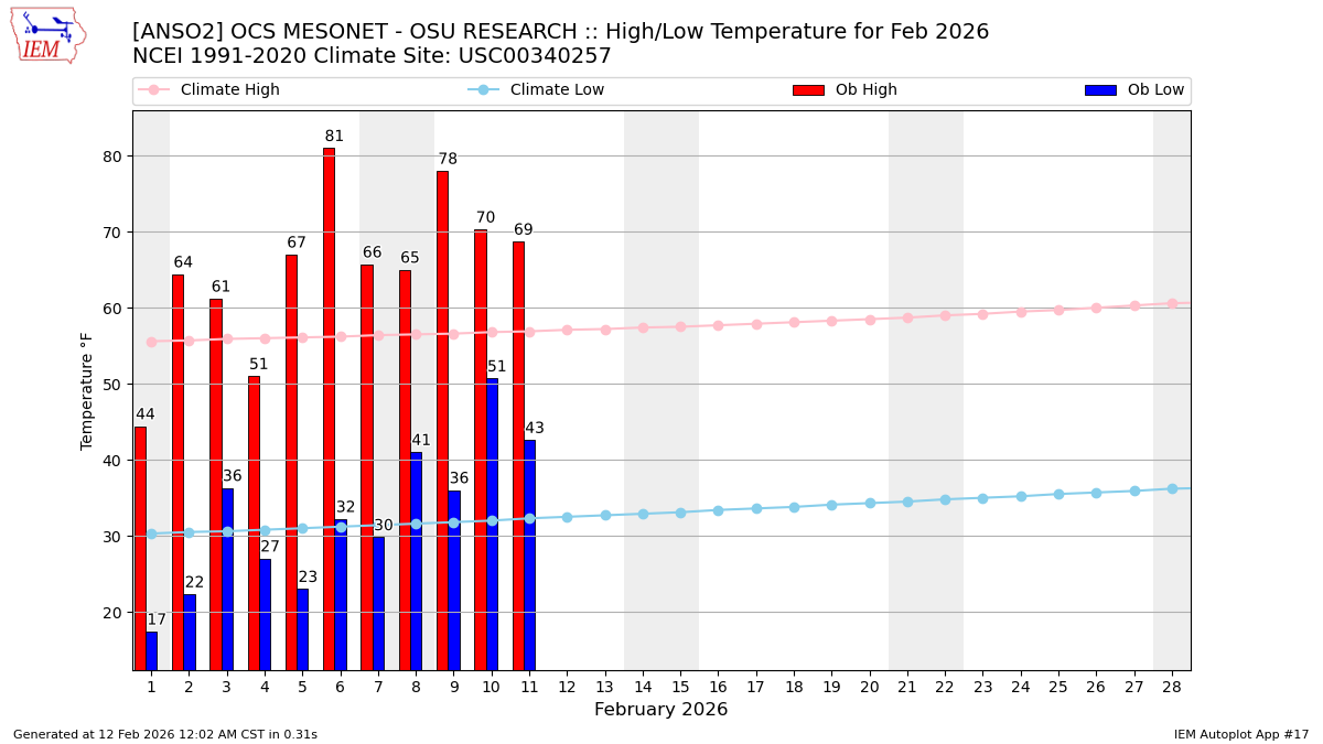 Description: This chart of the monthly temperature data. The bars are the observations and the dots are climatology.
