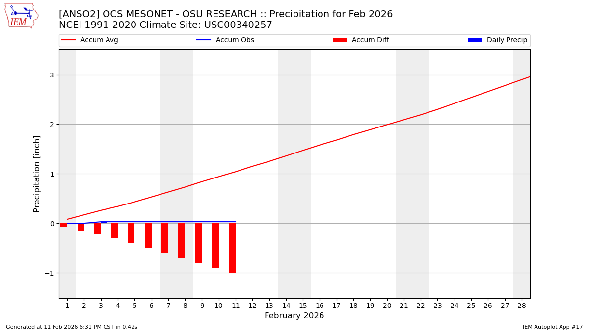Description: This chart is of daily precipitation for the month. The red line would be an average month while the blue line and bars are observations.