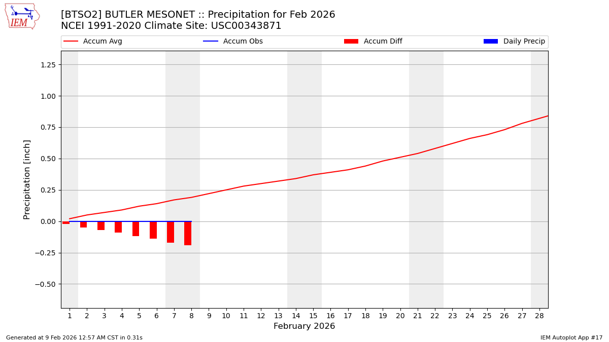 Description: This chart is of daily precipitation for the month. The red line would be an average month while the blue line and bars are observations.