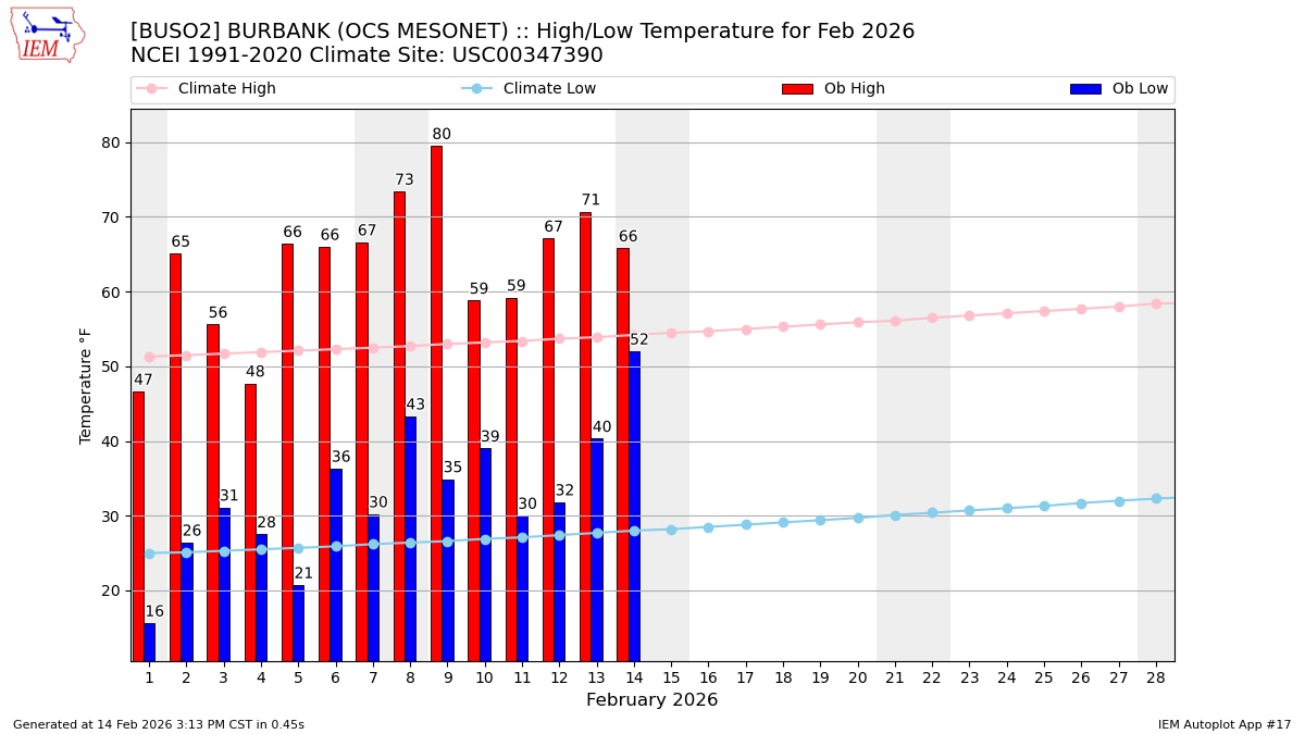 Description: This chart of the monthly temperature data. The bars are the observations and the dots are climatology.