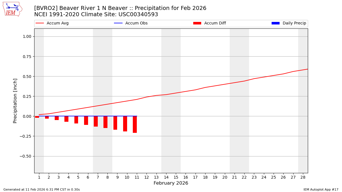 Description: This chart is of daily precipitation for the month. The red line would be an average month while the blue line and bars are observations.