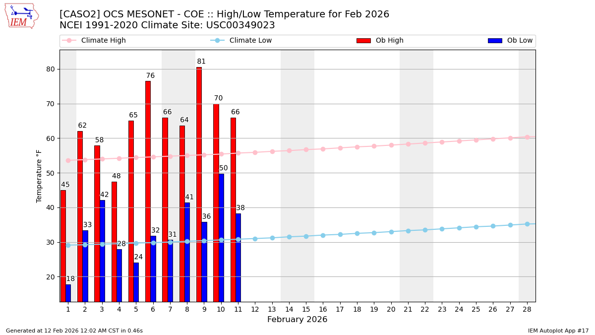 Description: This chart of the monthly temperature data. The bars are the observations and the dots are climatology.