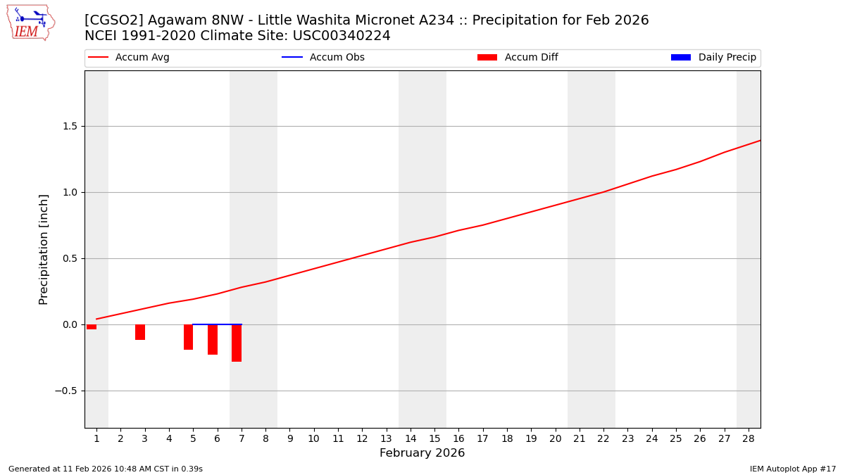 Description: This chart is of daily precipitation for the month. The red line would be an average month while the blue line and bars are observations.