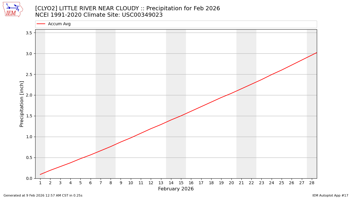 Description: This chart is of daily precipitation for the month. The red line would be an average month while the blue line and bars are observations.