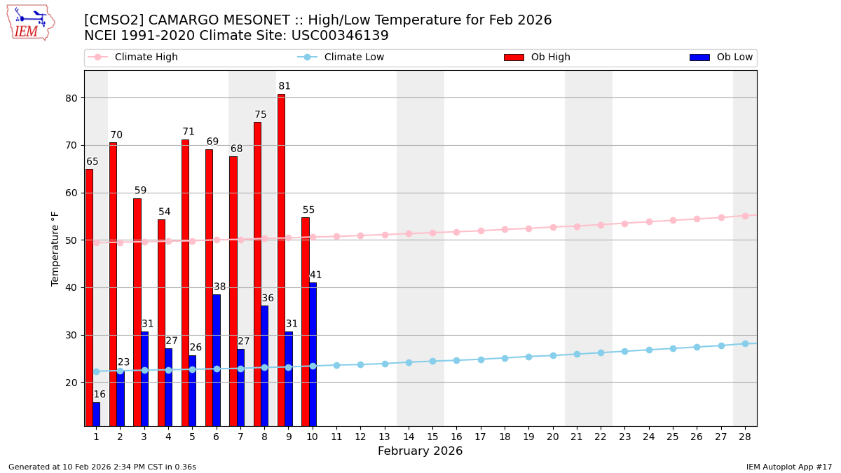 Description: This chart of the monthly temperature data. The bars are the observations and the dots are climatology.