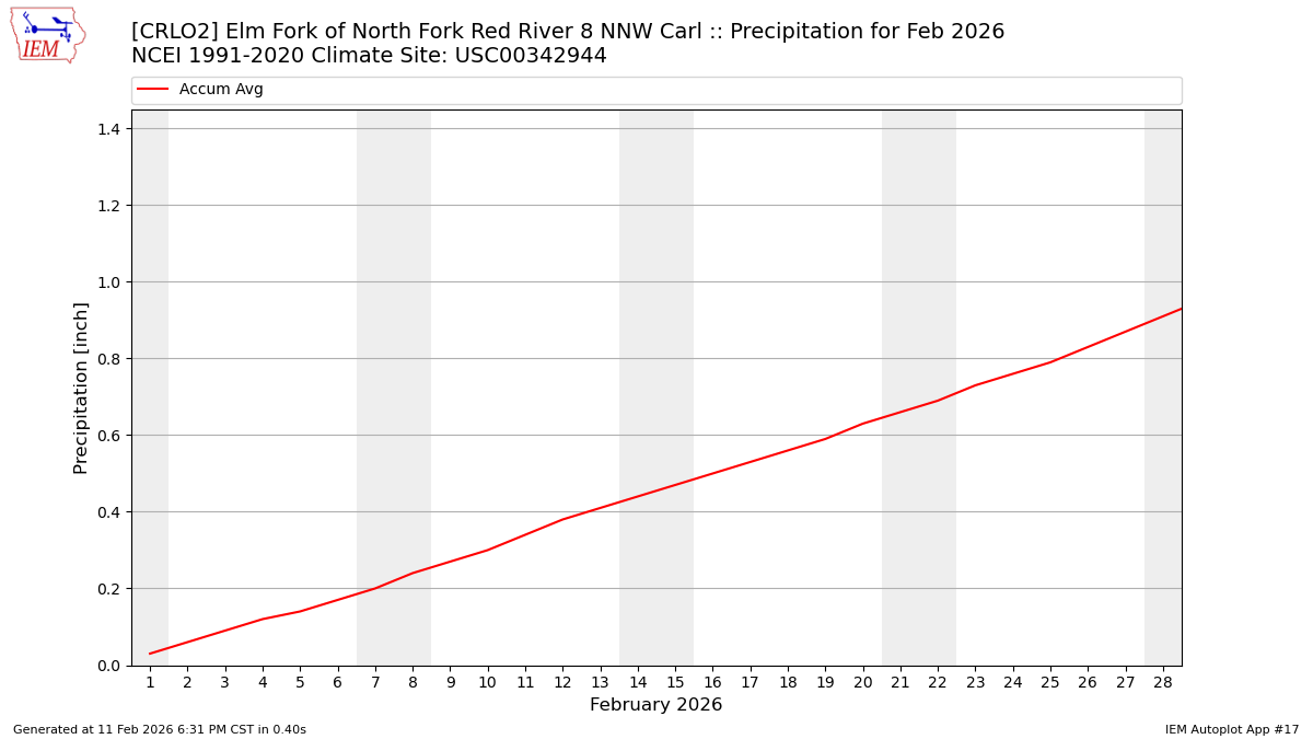Description: This chart is of daily precipitation for the month. The red line would be an average month while the blue line and bars are observations.