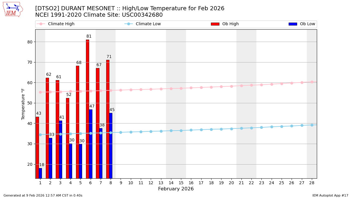 Description: This chart of the monthly temperature data. The bars are the observations and the dots are climatology.