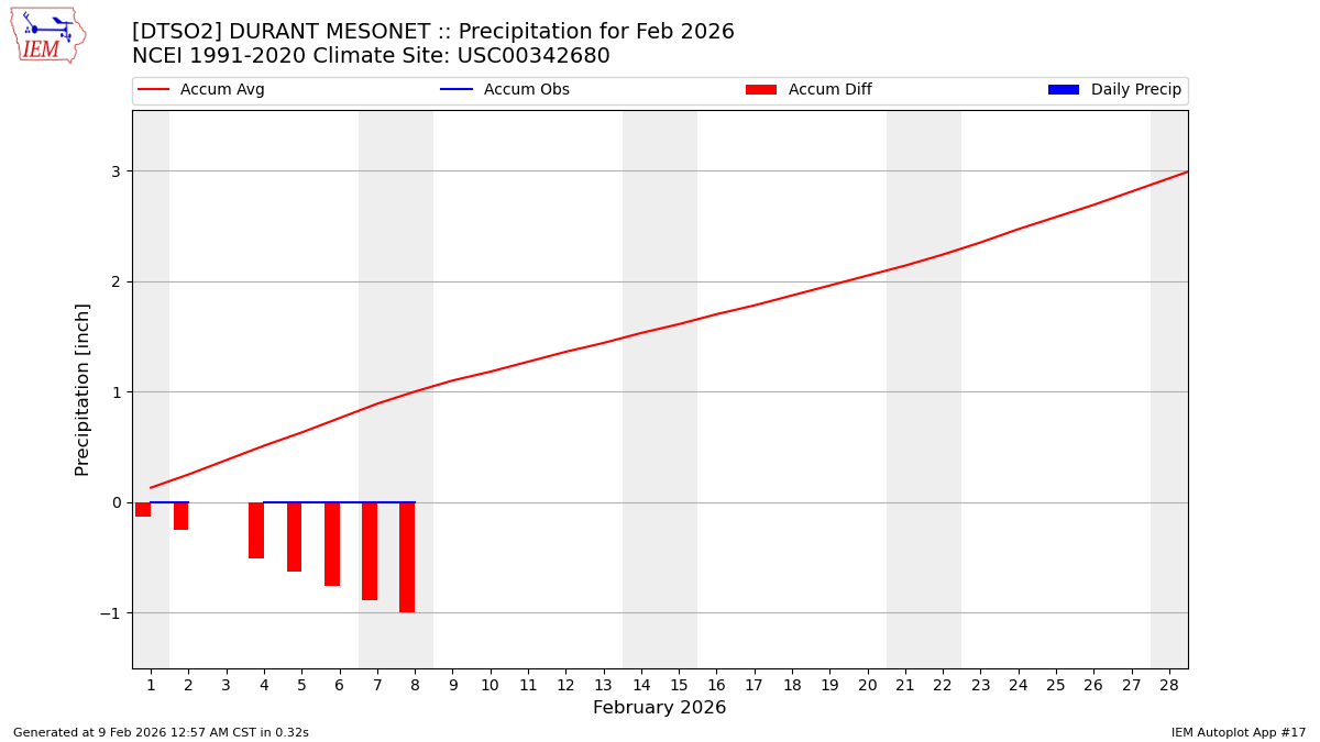 Description: This chart is of daily precipitation for the month. The red line would be an average month while the blue line and bars are observations.
