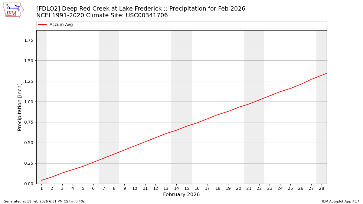 Description: This chart is of daily precipitation for the month. The red line would be an average month while the blue line and bars are observations.