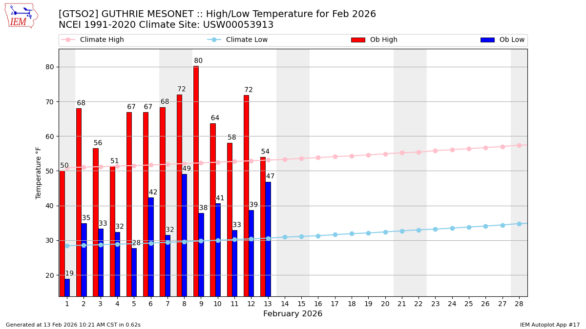 Description: This chart of the monthly temperature data. The bars are the observations and the dots are climatology.