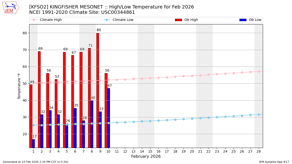 Description: This chart of the monthly temperature data. The bars are the observations and the dots are climatology.