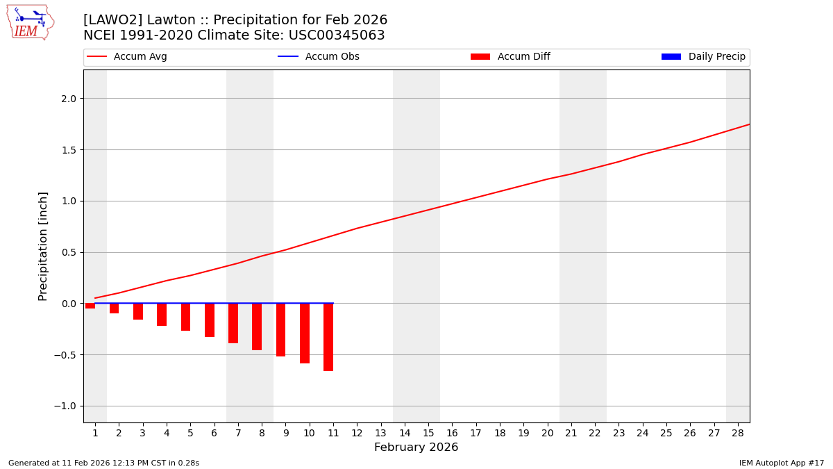 Description: This chart is of daily precipitation for the month. The red line would be an average month while the blue line and bars are observations.