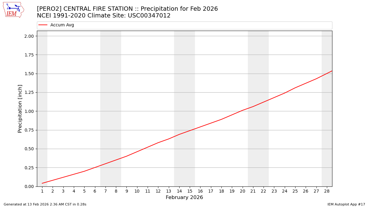 Description: This chart is of daily precipitation for the month. The red line would be an average month while the blue line and bars are observations.