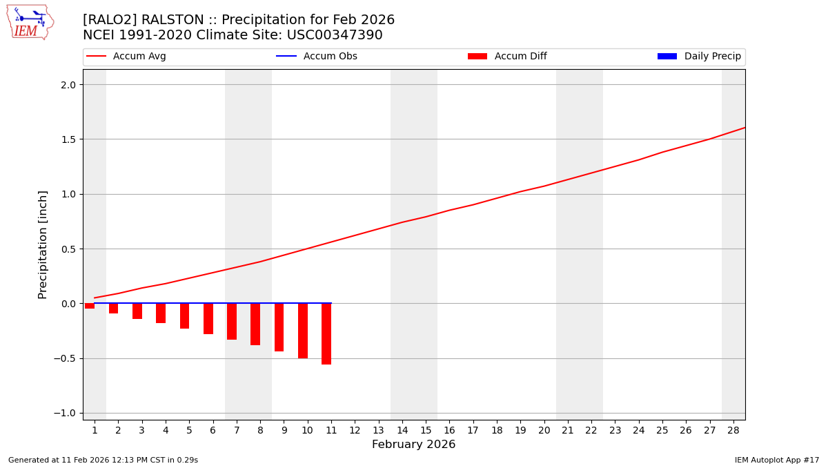Description: This chart is of daily precipitation for the month. The red line would be an average month while the blue line and bars are observations.