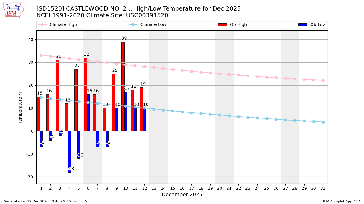 Description: This chart of the monthly temperature data. The bars are the observations and the dots are climatology.