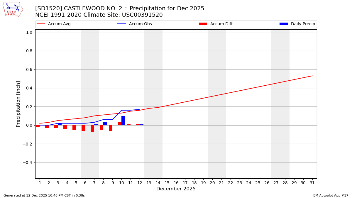 Description: This chart is of daily precipitation for the month. The red line would be an average month while the blue line and bars are observations.