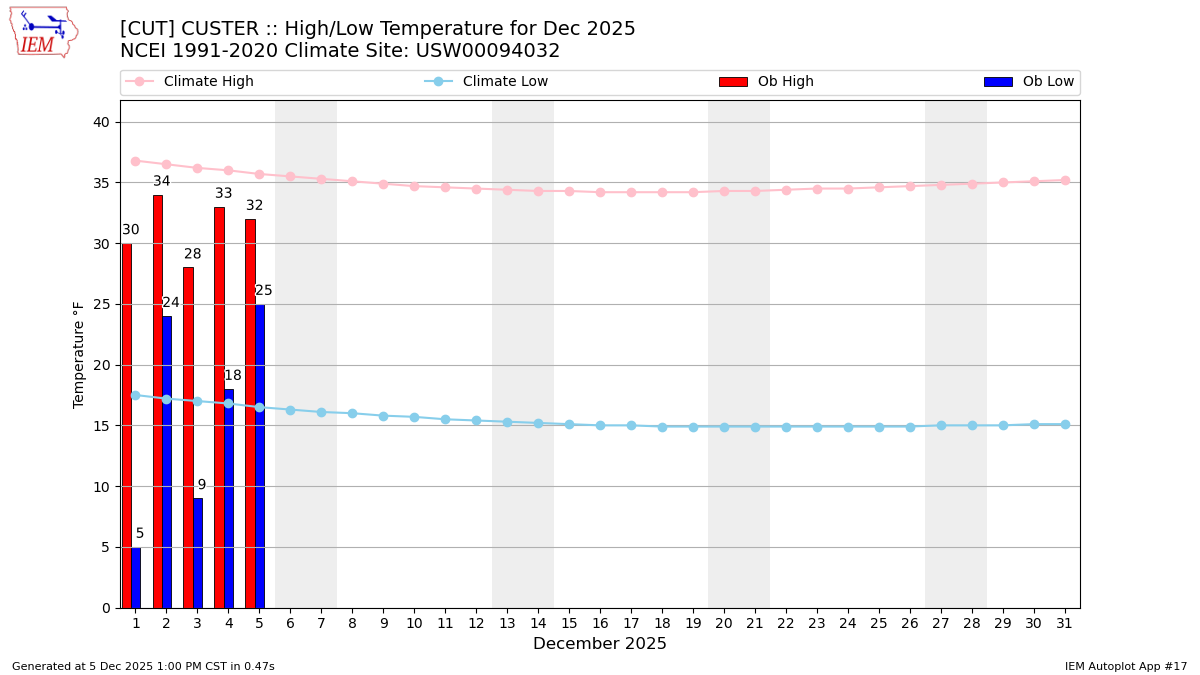 Description: This chart of the monthly temperature data. The bars are the observations and the dots are climatology.