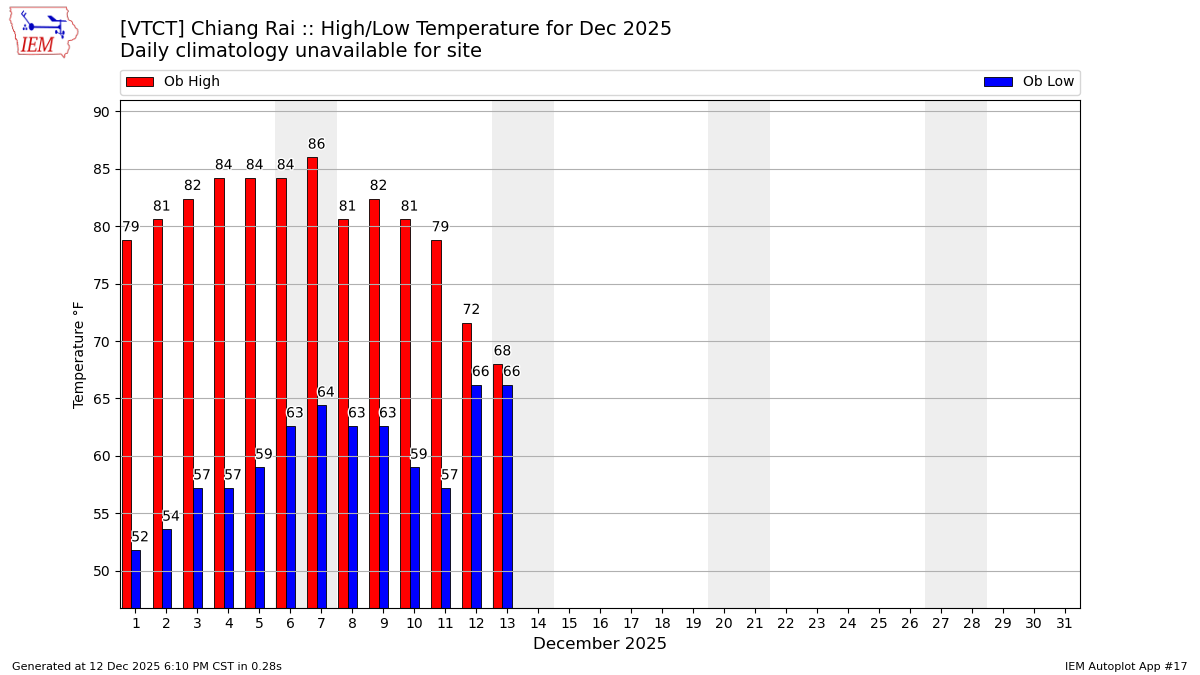 Description: This chart of the monthly temperature data. The bars are the observations and the dots are climatology.