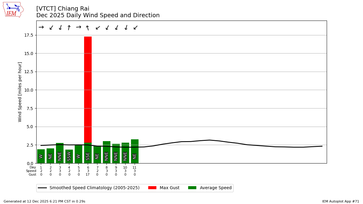 Description: This chart is of daily precipitation for the month. The red line would be an average month while the blue line and bars are observations.