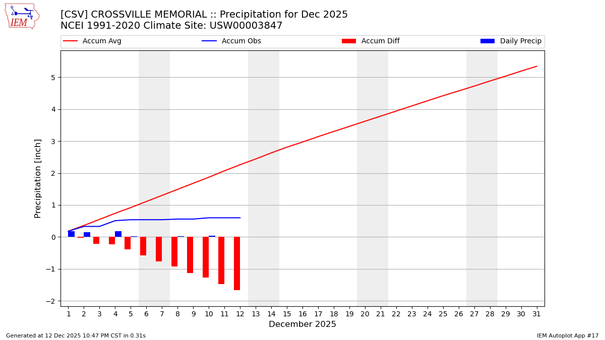 Description: This chart is of daily precipitation for the month. The red line would be an average month while the blue line and bars are observations.