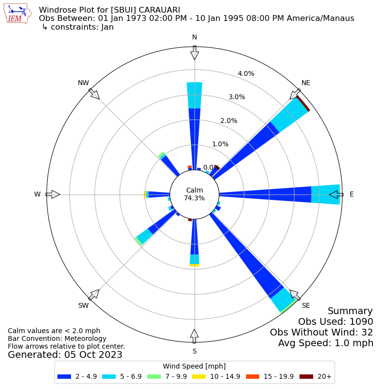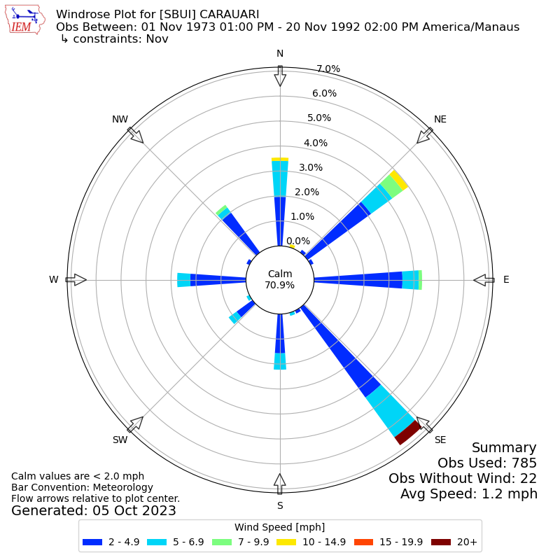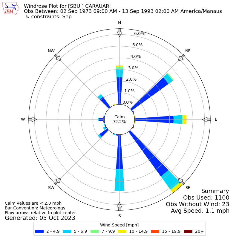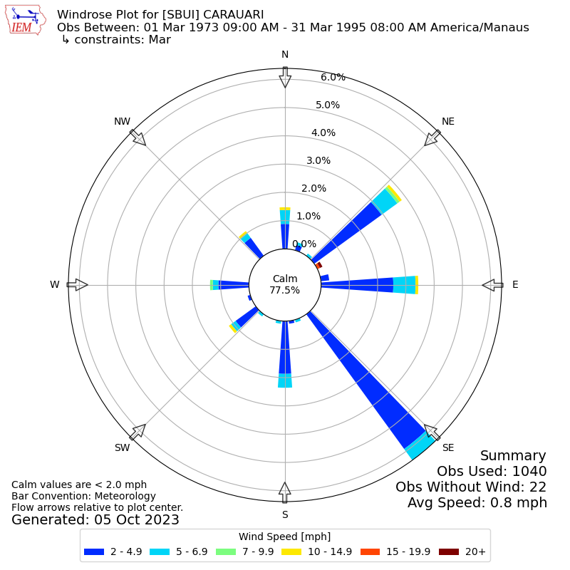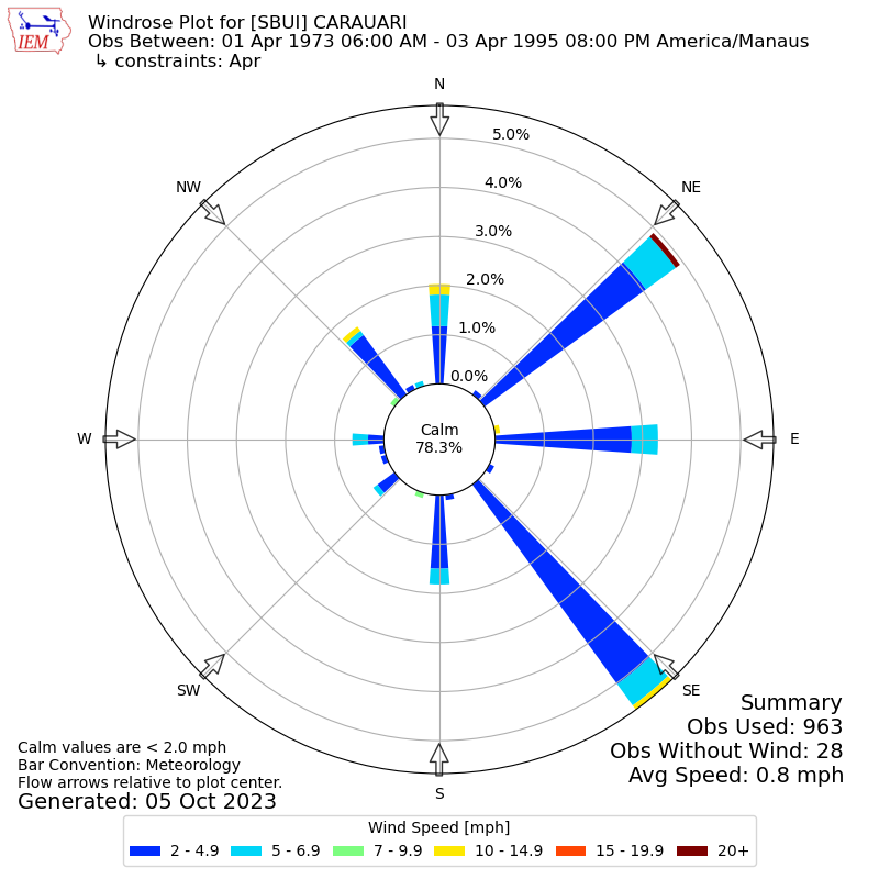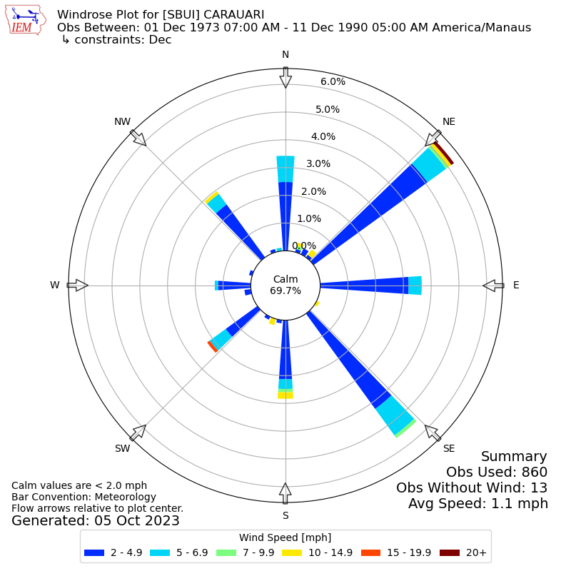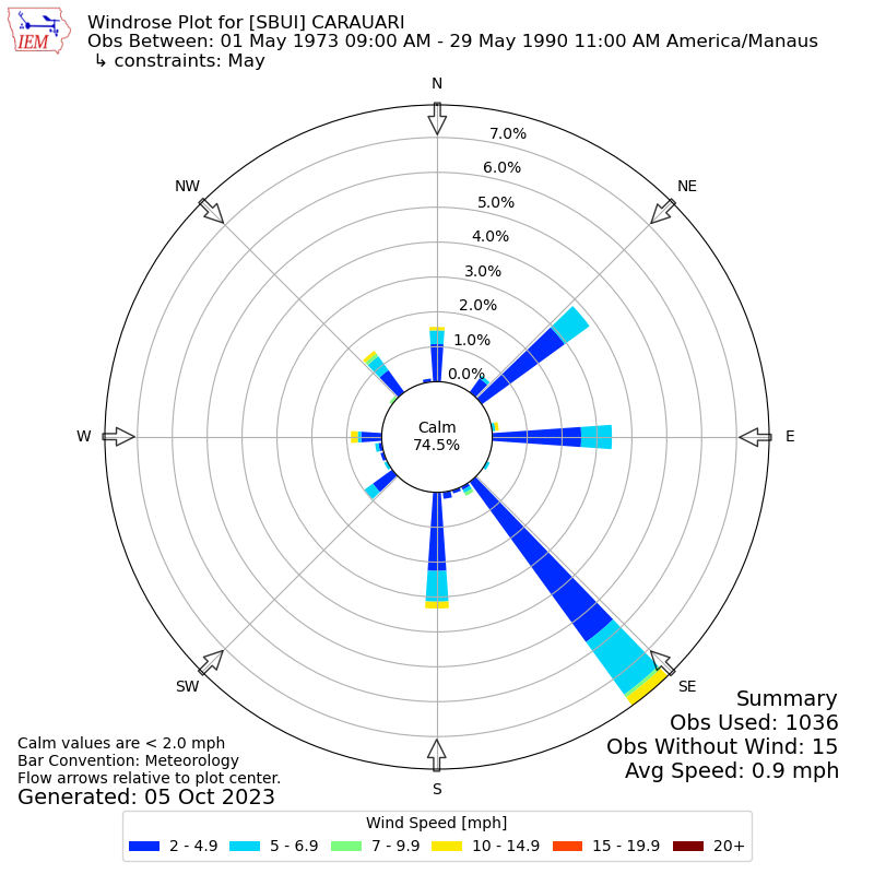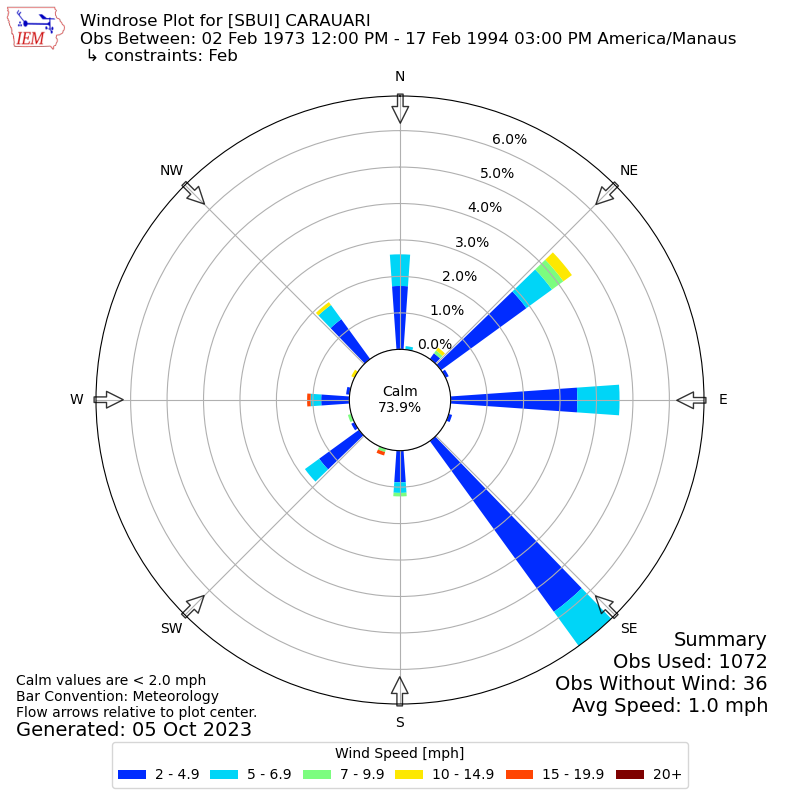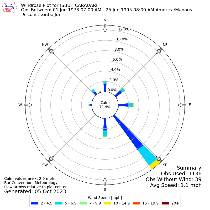 The IEM has generated these wind roses based on our archive. The archive does contain errors and non-representative data, so please use care when using these plots. In general, data from airports is of good quality and representative of the local surrounding area.