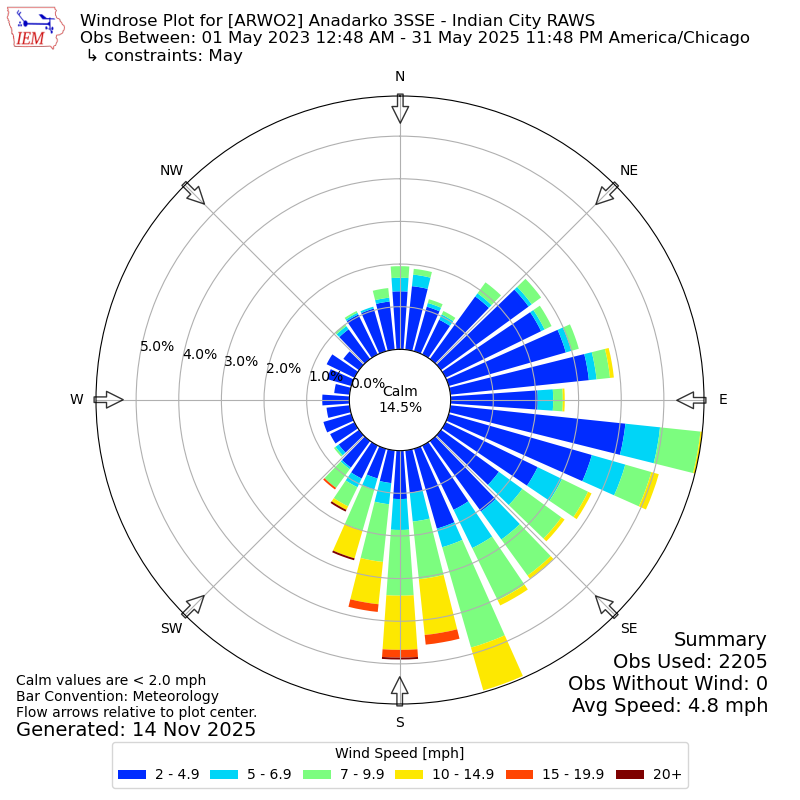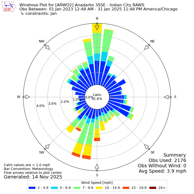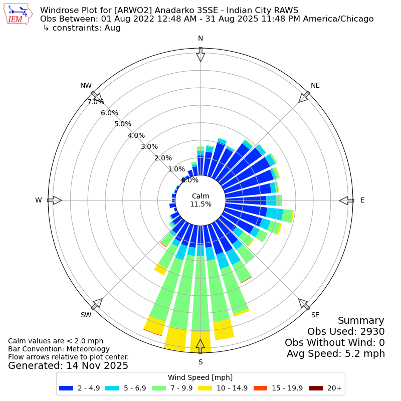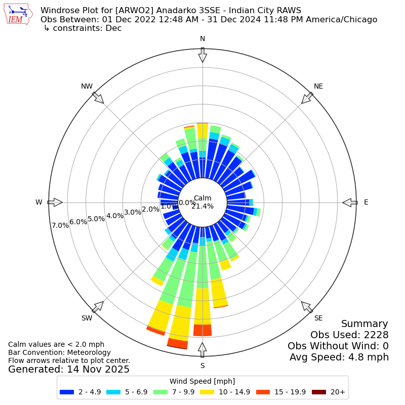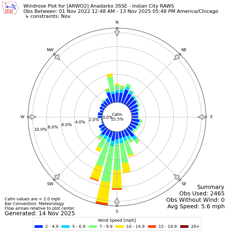 The IEM has generated these wind roses based on our archive. The archive does contain errors and non-representative data, so please use care when using these plots. In general, data from airports is of good quality and representative of the local surrounding area.