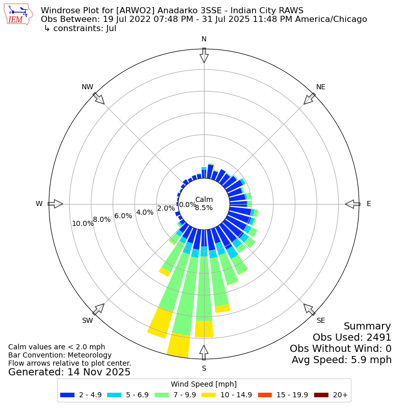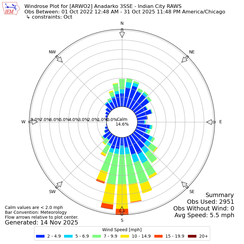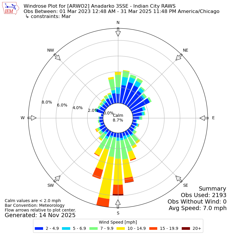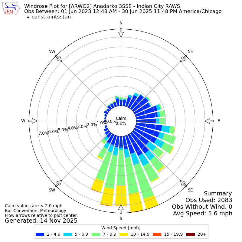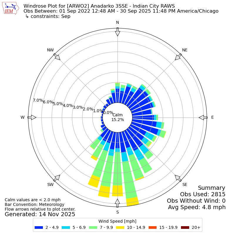 The IEM has generated these wind roses based on our archive. The archive does contain errors and non-representative data, so please use care when using these plots. In general, data from airports is of good quality and representative of the local surrounding area.