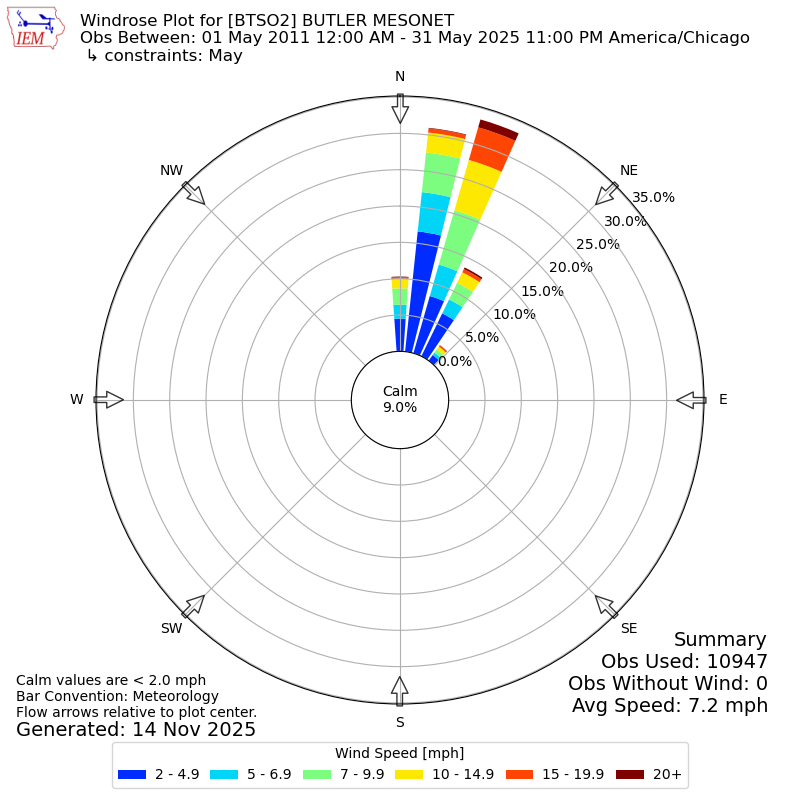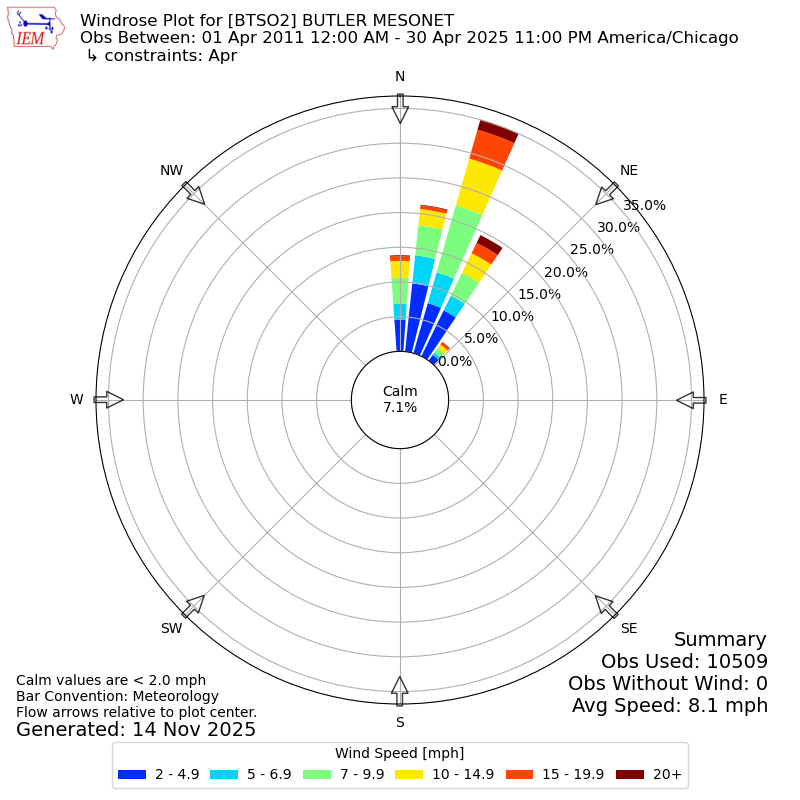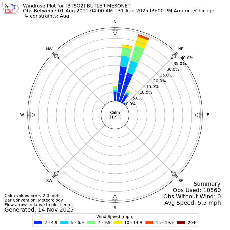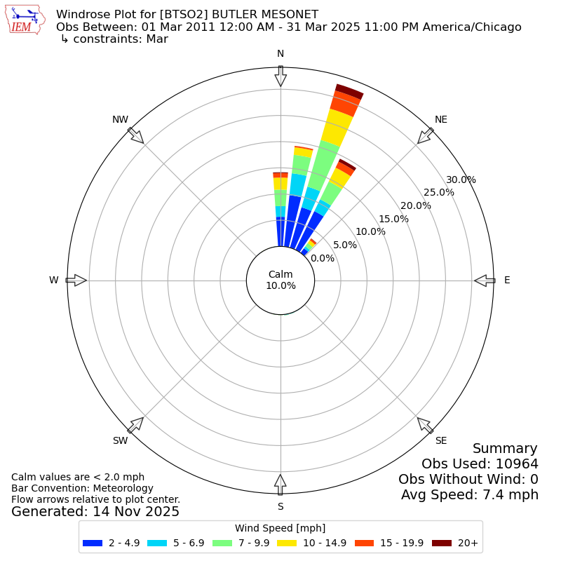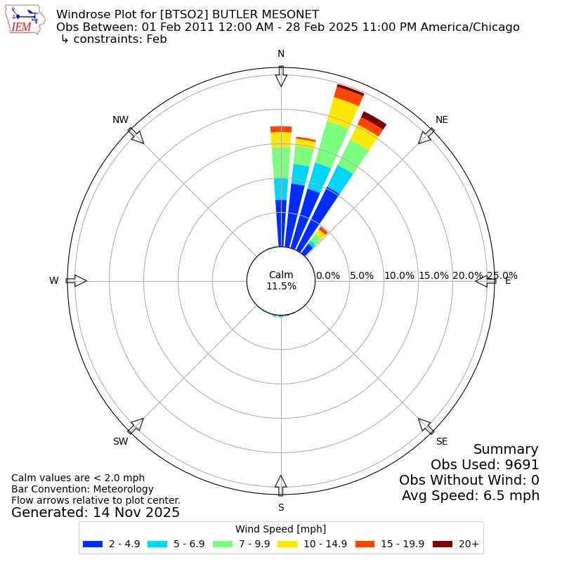 The IEM has generated these wind roses based on our archive. The archive does contain errors and non-representative data, so please use care when using these plots. In general, data from airports is of good quality and representative of the local surrounding area.