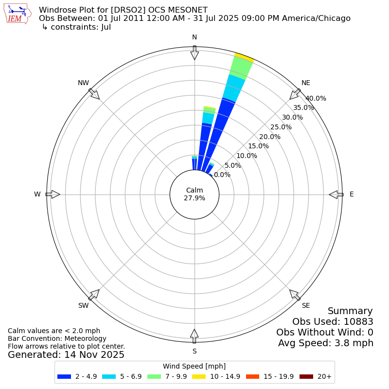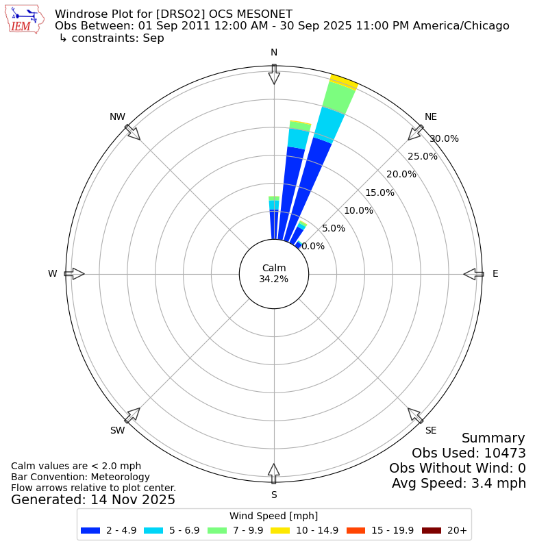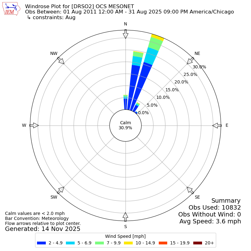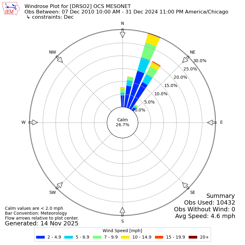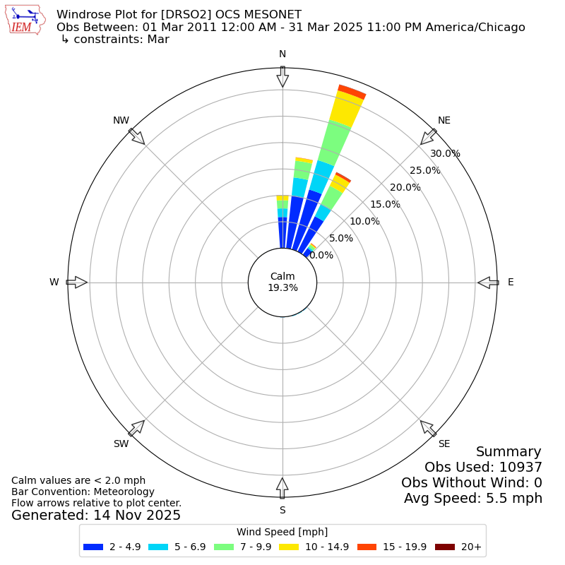 The IEM has generated these wind roses based on our archive. The archive does contain errors and non-representative data, so please use care when using these plots. In general, data from airports is of good quality and representative of the local surrounding area.