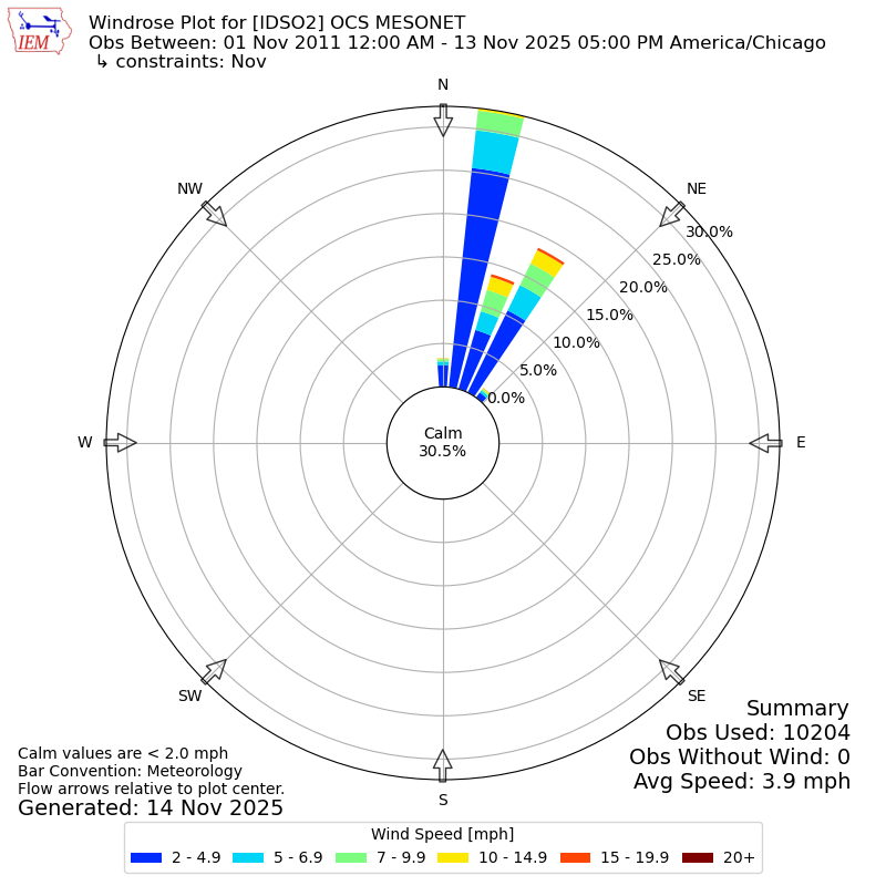 The IEM has generated these wind roses based on our archive. The archive does contain errors and non-representative data, so please use care when using these plots. In general, data from airports is of good quality and representative of the local surrounding area.