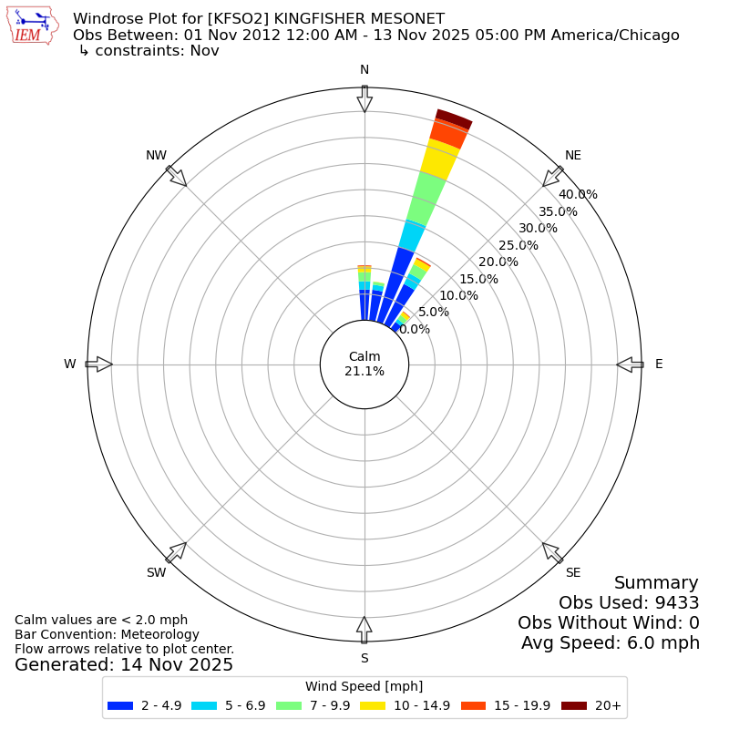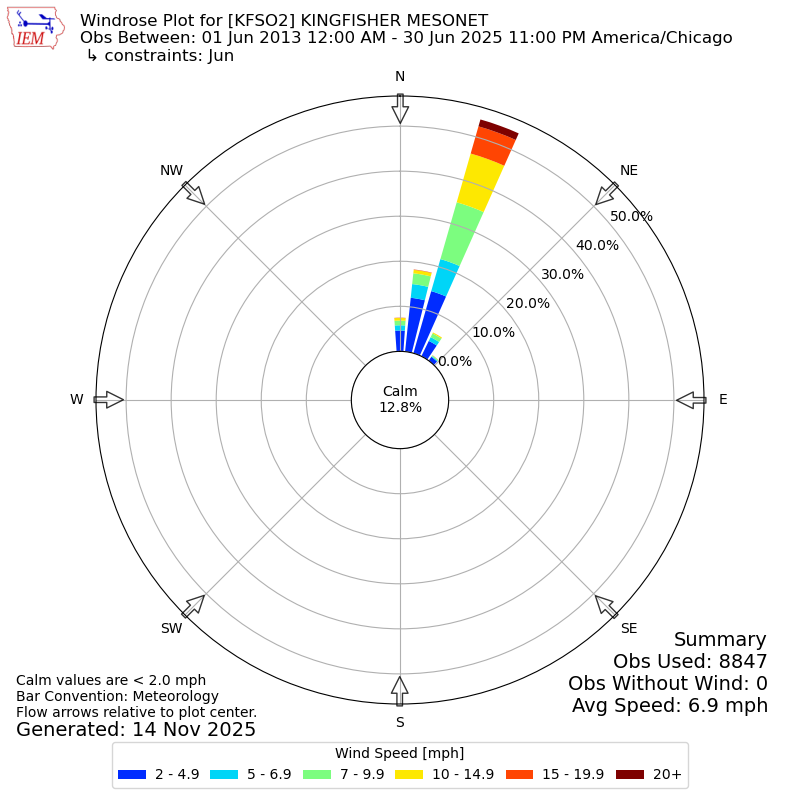 The IEM has generated these wind roses based on our archive. The archive does contain errors and non-representative data, so please use care when using these plots. In general, data from airports is of good quality and representative of the local surrounding area.