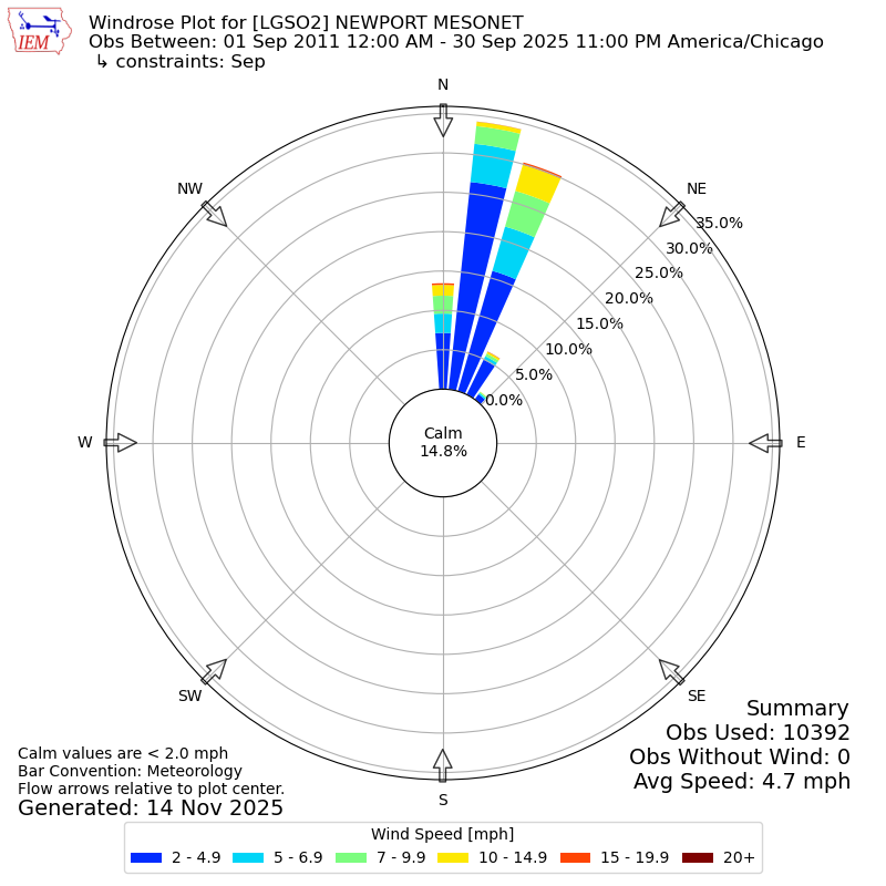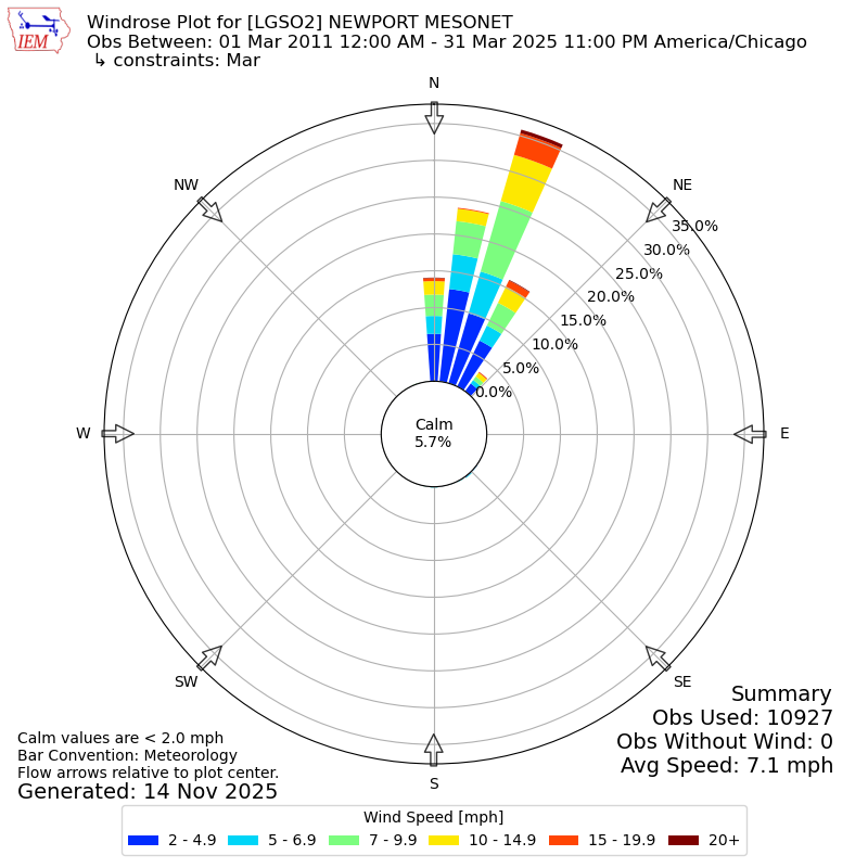 The IEM has generated these wind roses based on our archive. The archive does contain errors and non-representative data, so please use care when using these plots. In general, data from airports is of good quality and representative of the local surrounding area.