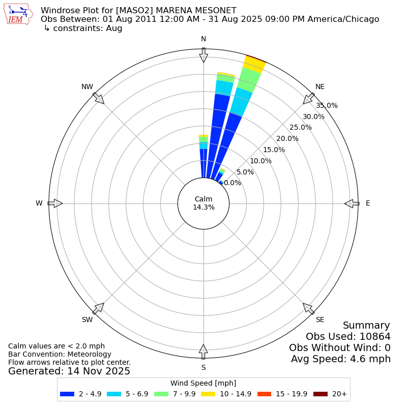 The IEM has generated these wind roses based on our archive. The archive does contain errors and non-representative data, so please use care when using these plots. In general, data from airports is of good quality and representative of the local surrounding area.