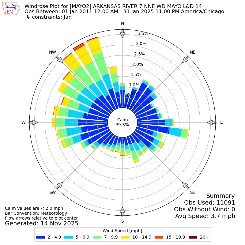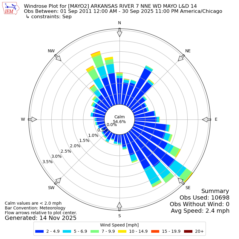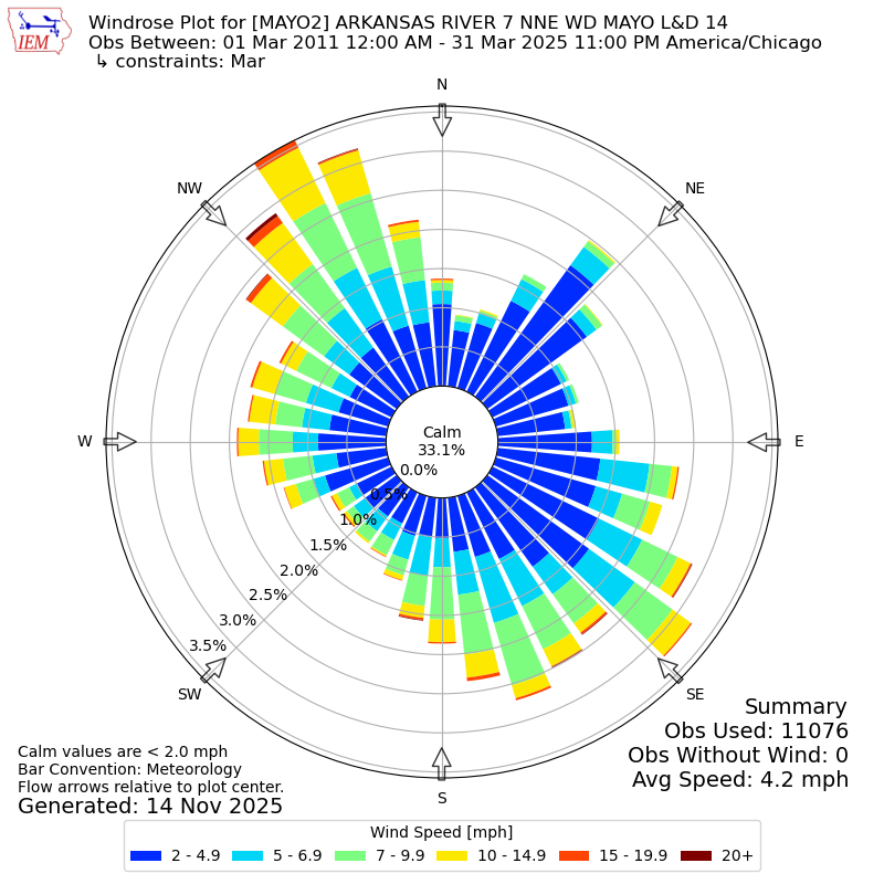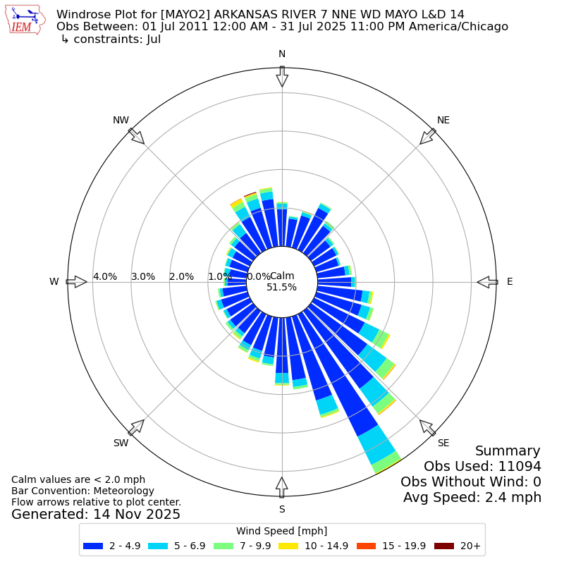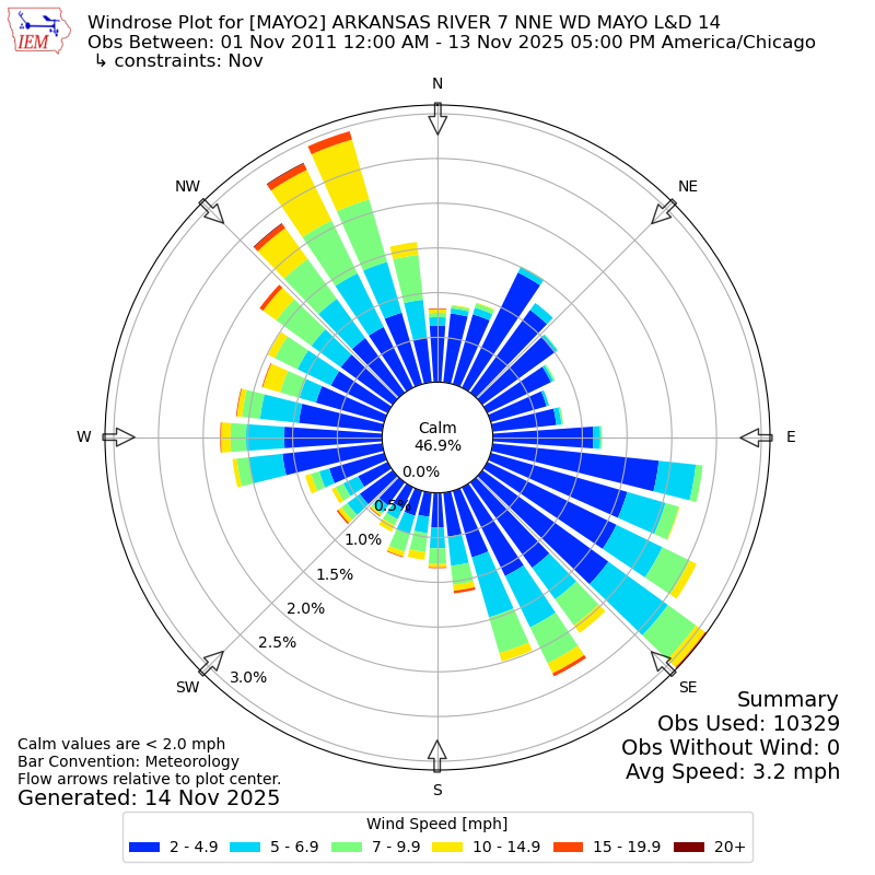 The IEM has generated these wind roses based on our archive. The archive does contain errors and non-representative data, so please use care when using these plots. In general, data from airports is of good quality and representative of the local surrounding area.