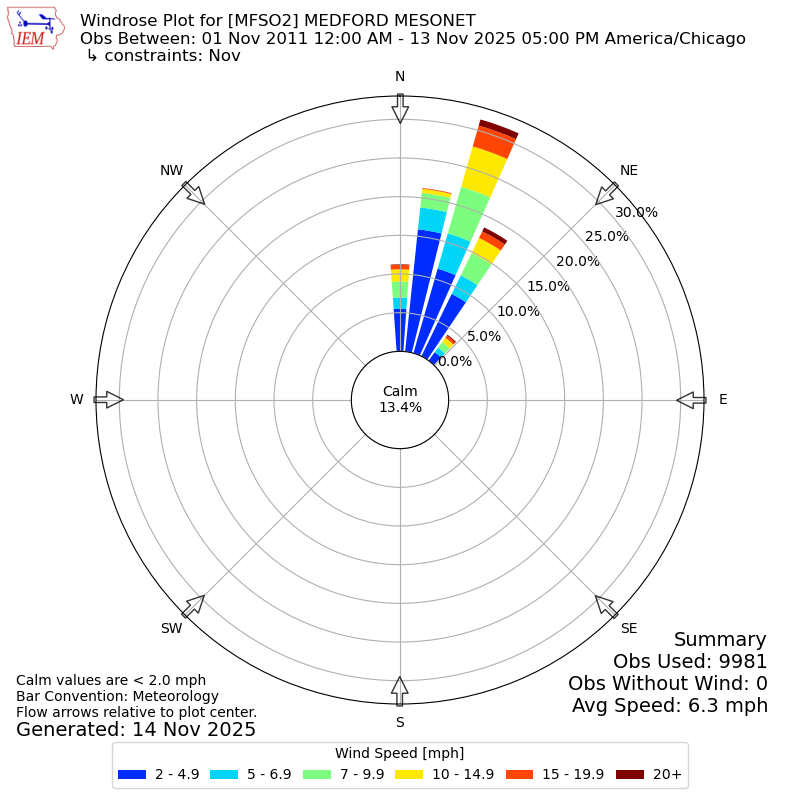 The IEM has generated these wind roses based on our archive. The archive does contain errors and non-representative data, so please use care when using these plots. In general, data from airports is of good quality and representative of the local surrounding area.