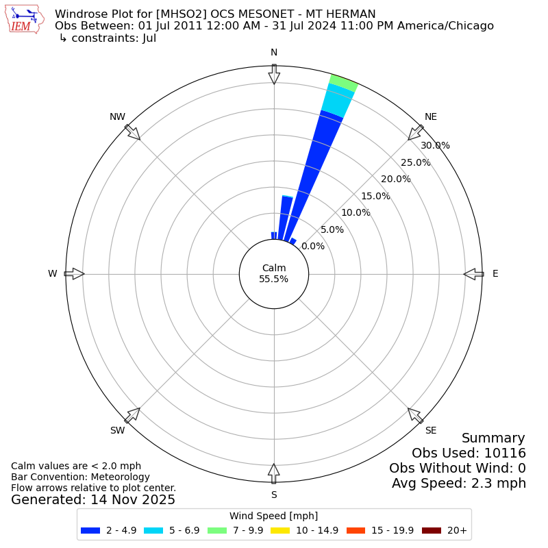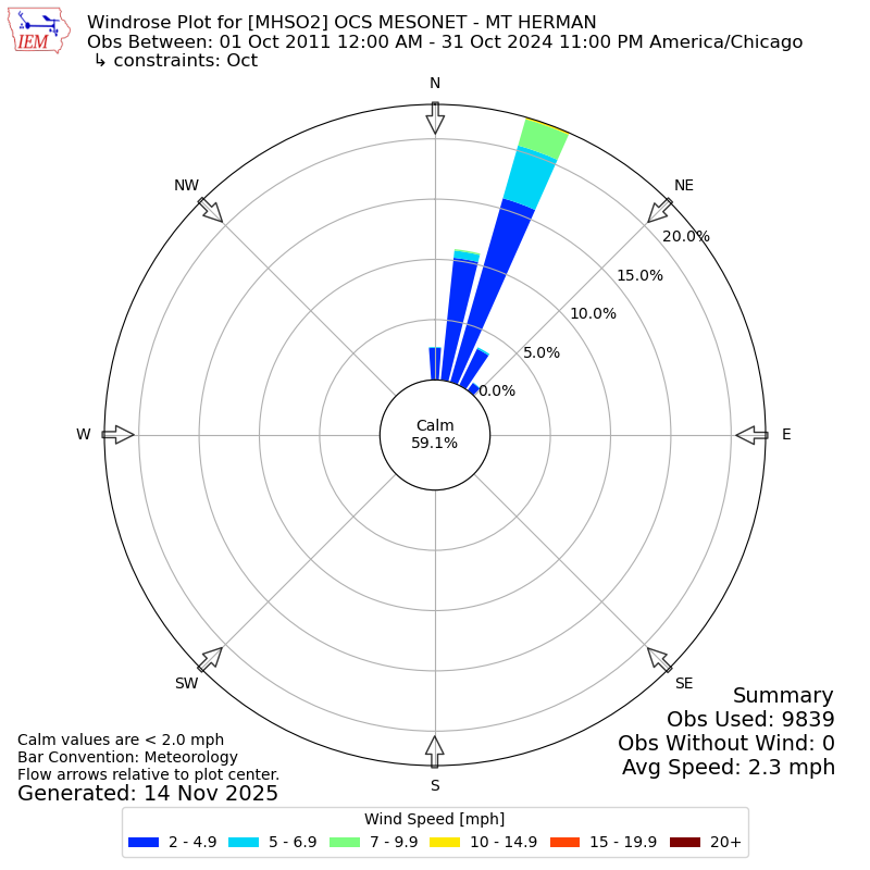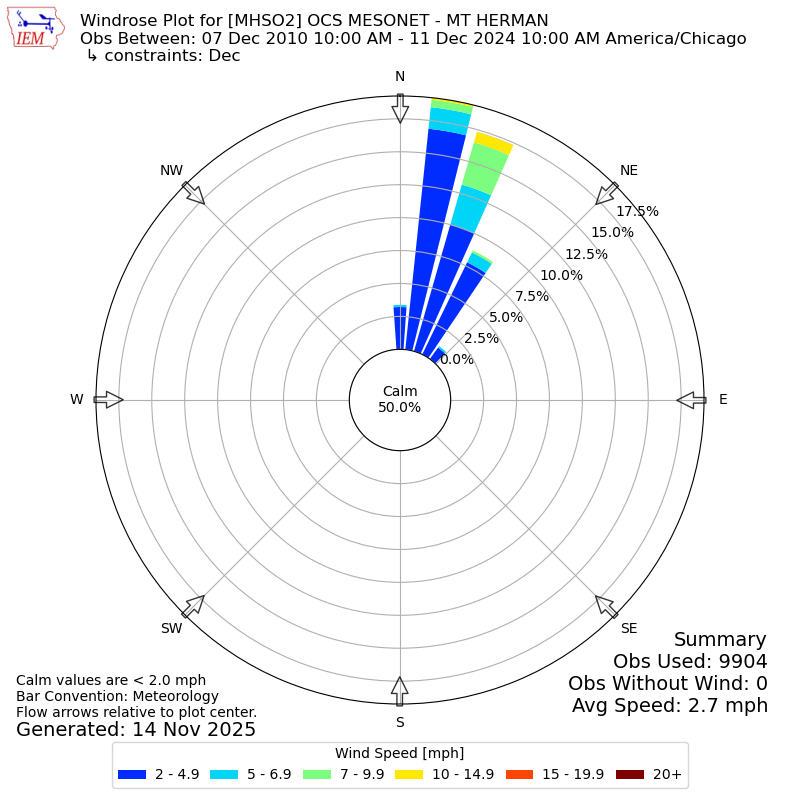 The IEM has generated these wind roses based on our archive. The archive does contain errors and non-representative data, so please use care when using these plots. In general, data from airports is of good quality and representative of the local surrounding area.