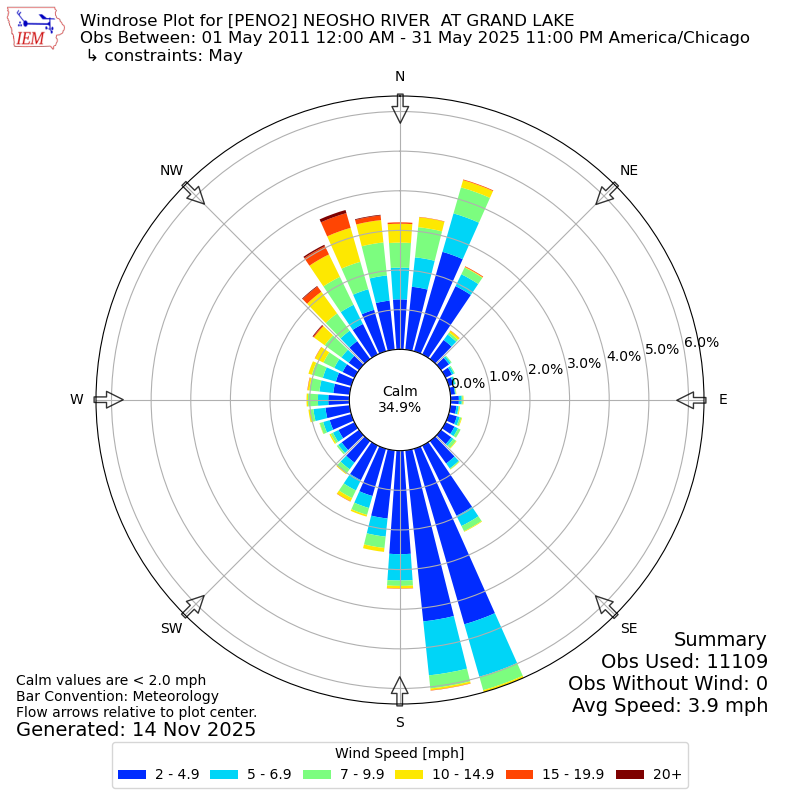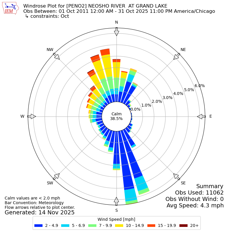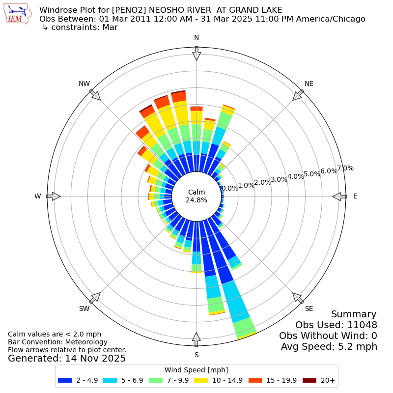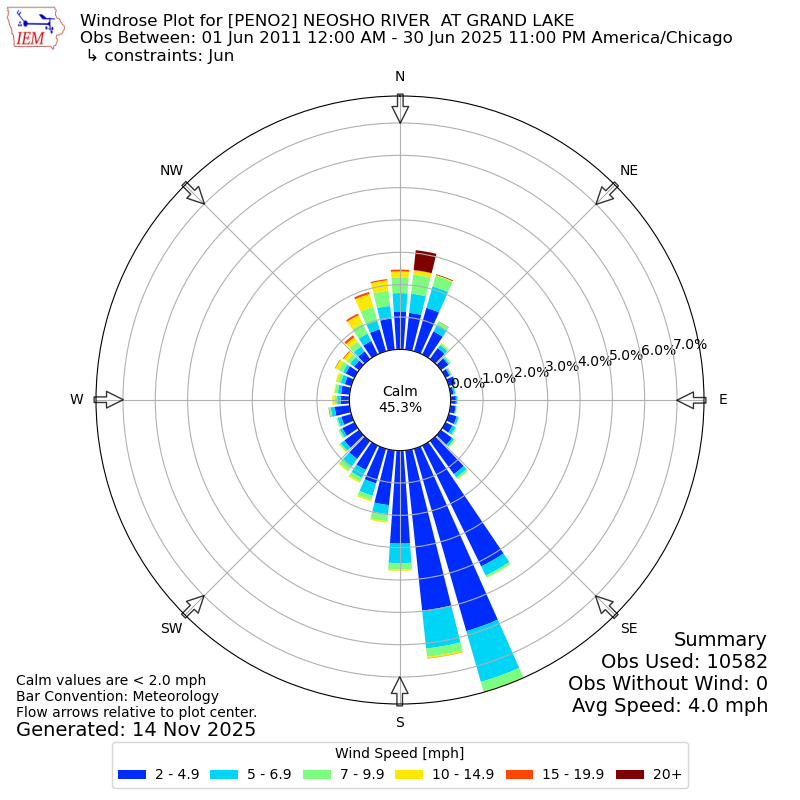 The IEM has generated these wind roses based on our archive. The archive does contain errors and non-representative data, so please use care when using these plots. In general, data from airports is of good quality and representative of the local surrounding area.