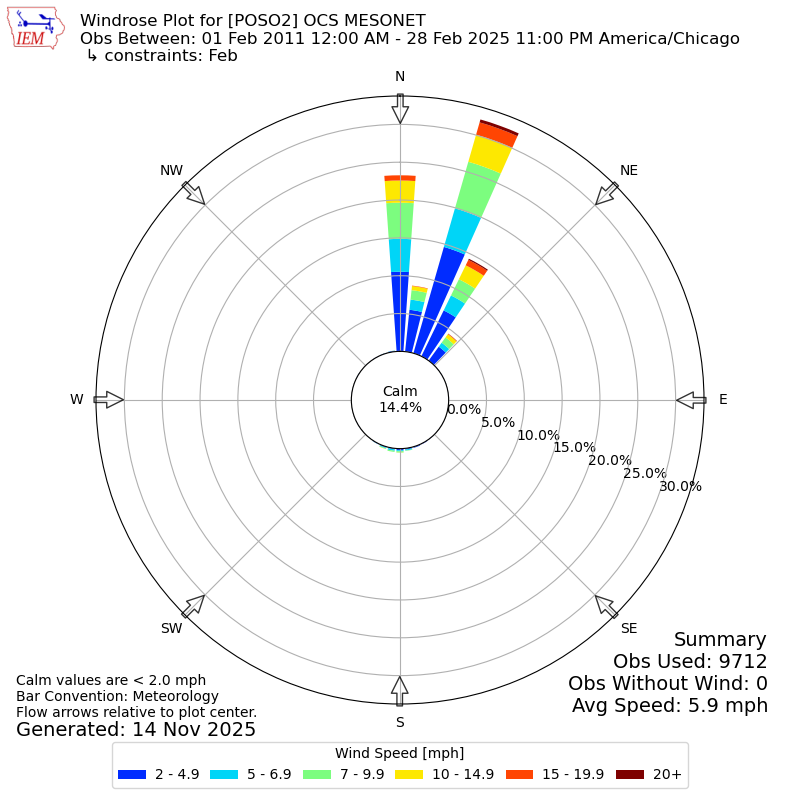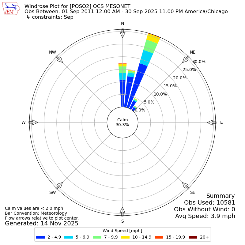 The IEM has generated these wind roses based on our archive. The archive does contain errors and non-representative data, so please use care when using these plots. In general, data from airports is of good quality and representative of the local surrounding area.