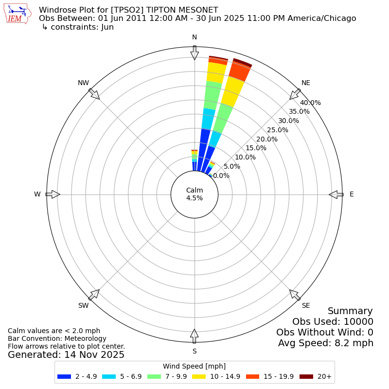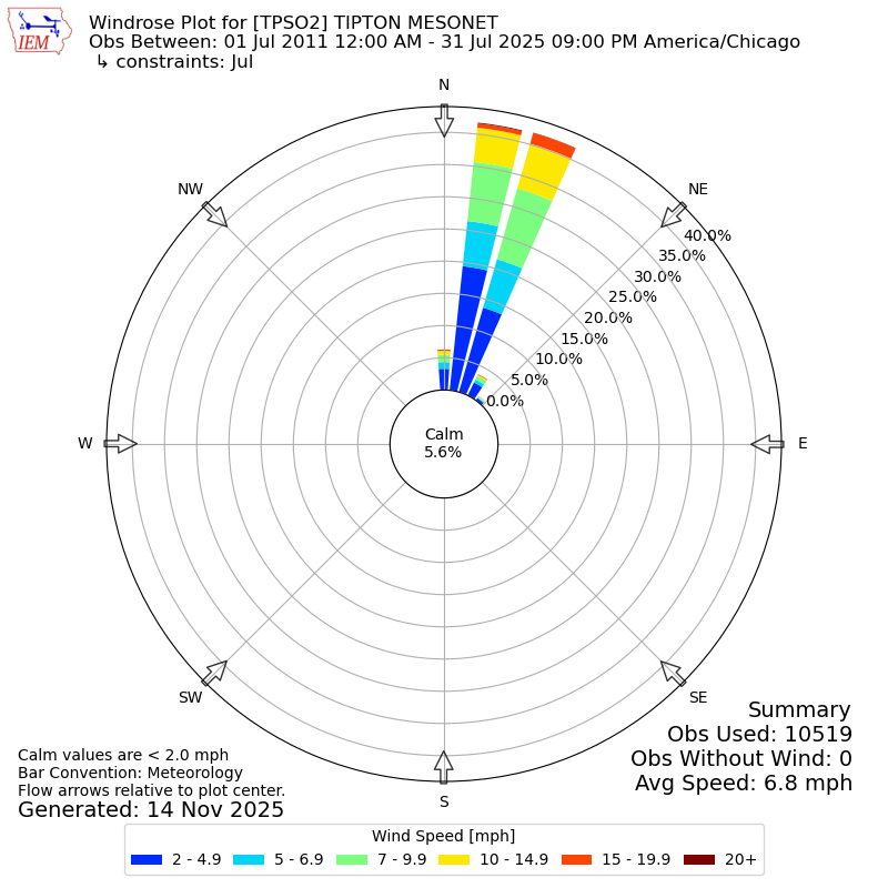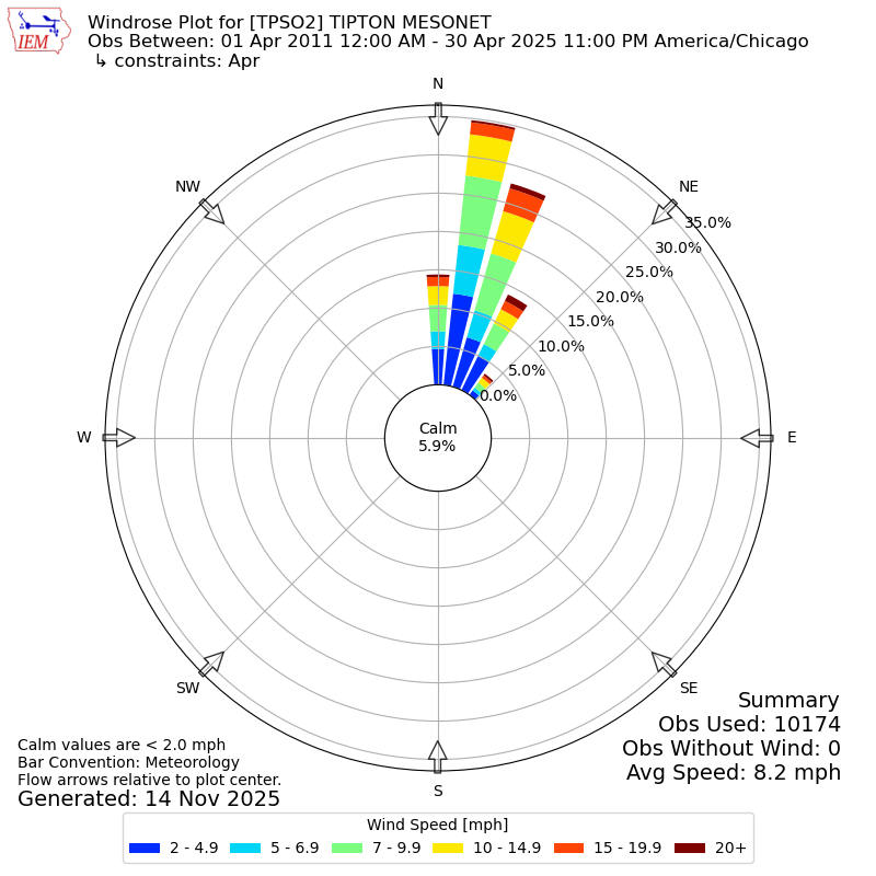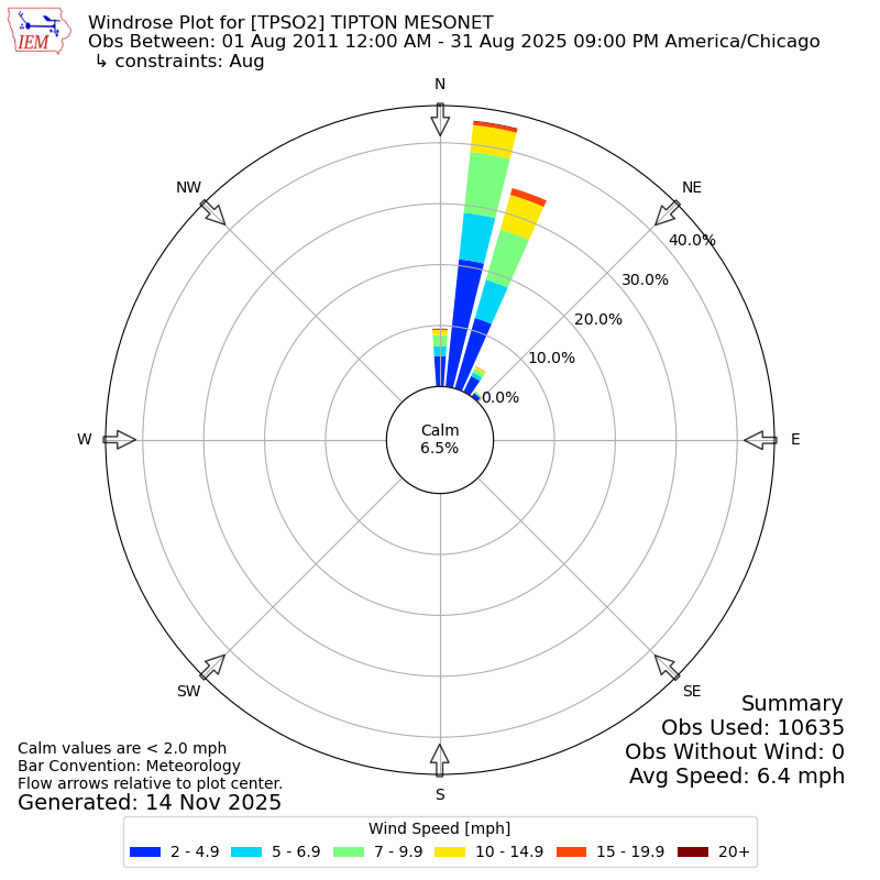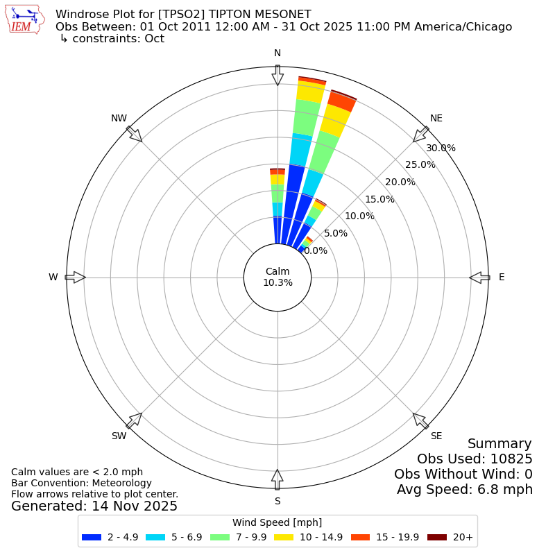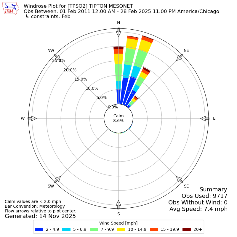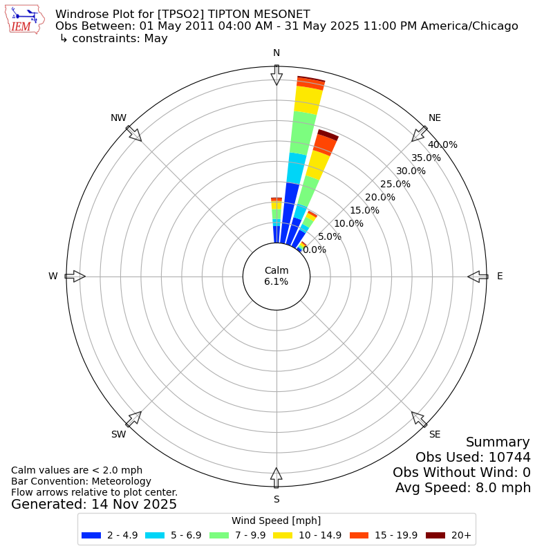 The IEM has generated these wind roses based on our archive. The archive does contain errors and non-representative data, so please use care when using these plots. In general, data from airports is of good quality and representative of the local surrounding area.