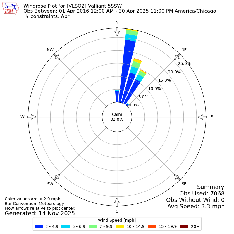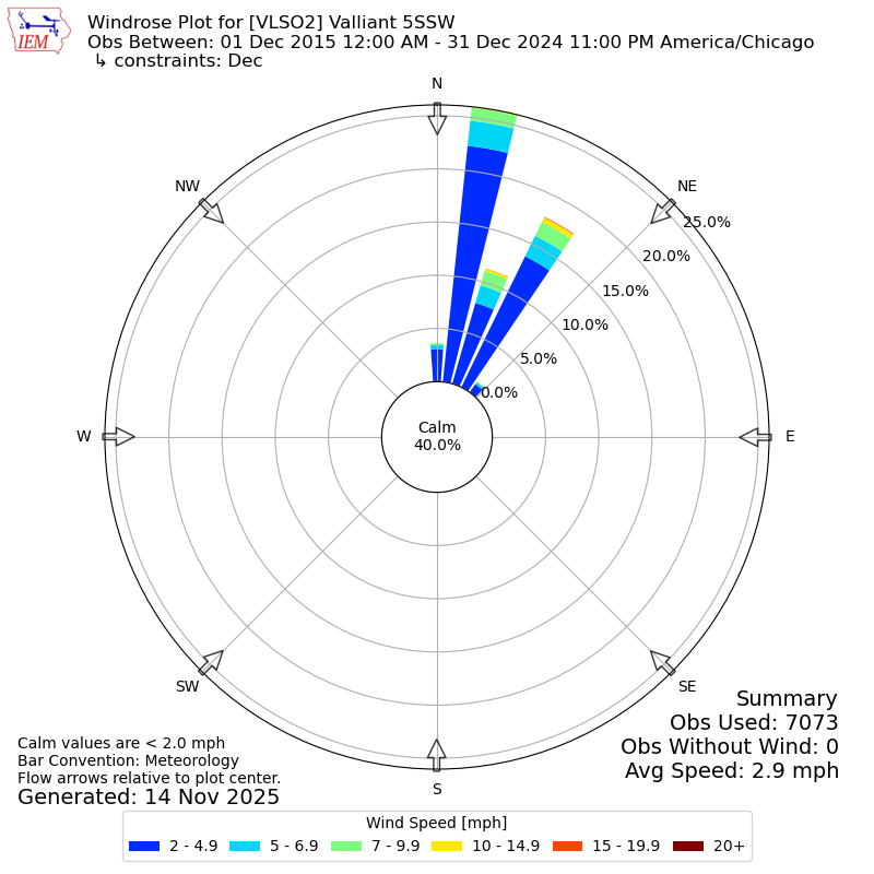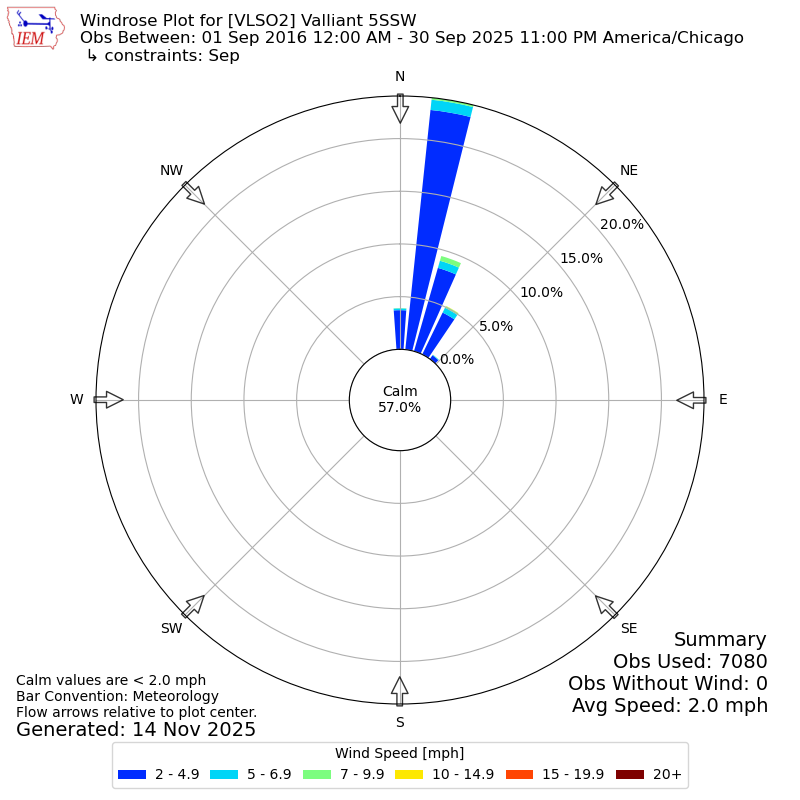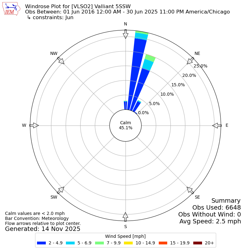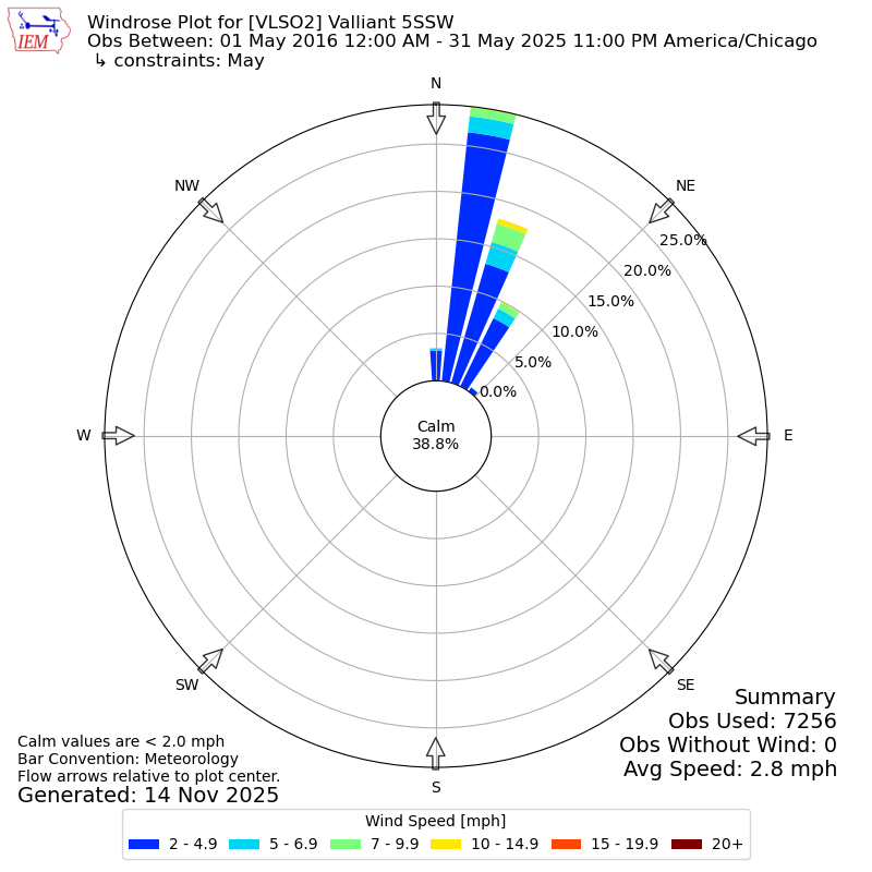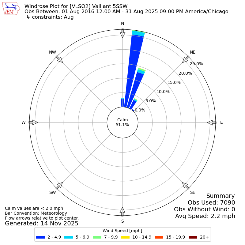 The IEM has generated these wind roses based on our archive. The archive does contain errors and non-representative data, so please use care when using these plots. In general, data from airports is of good quality and representative of the local surrounding area.