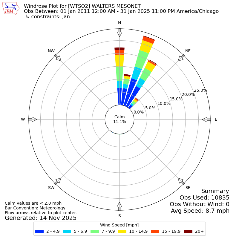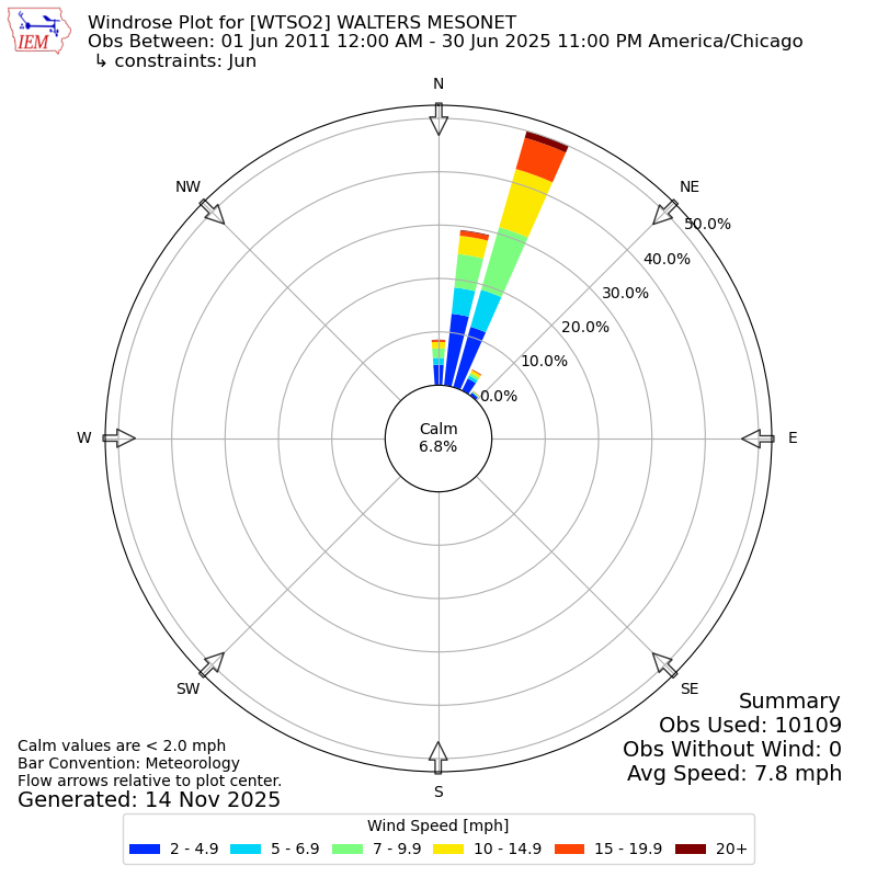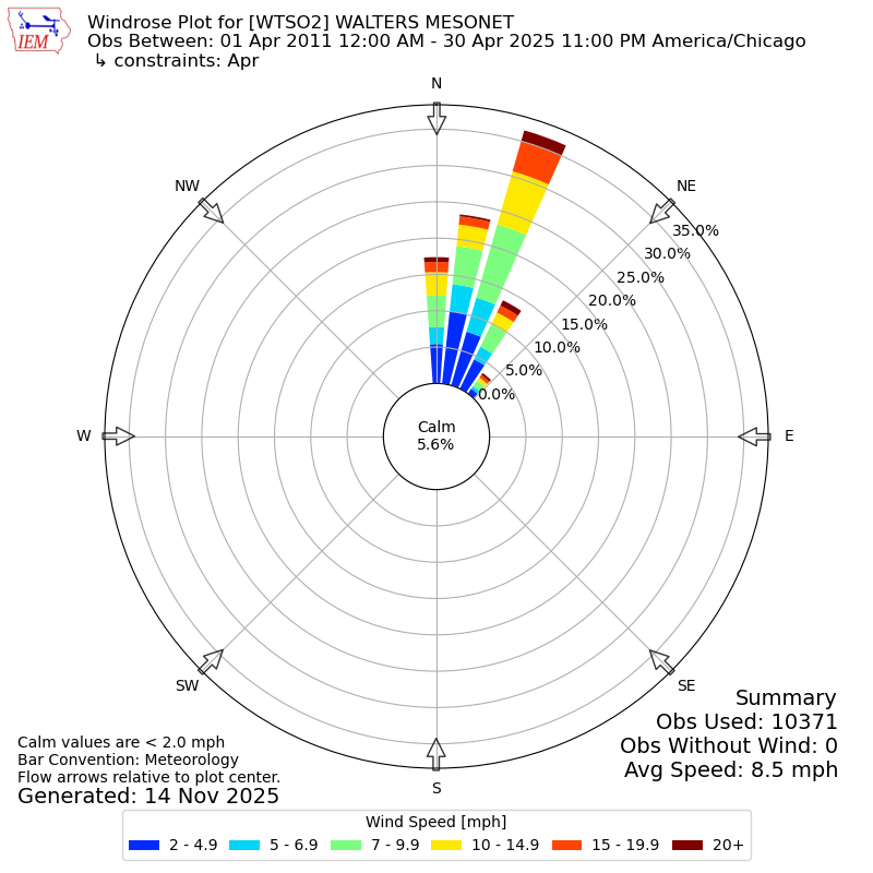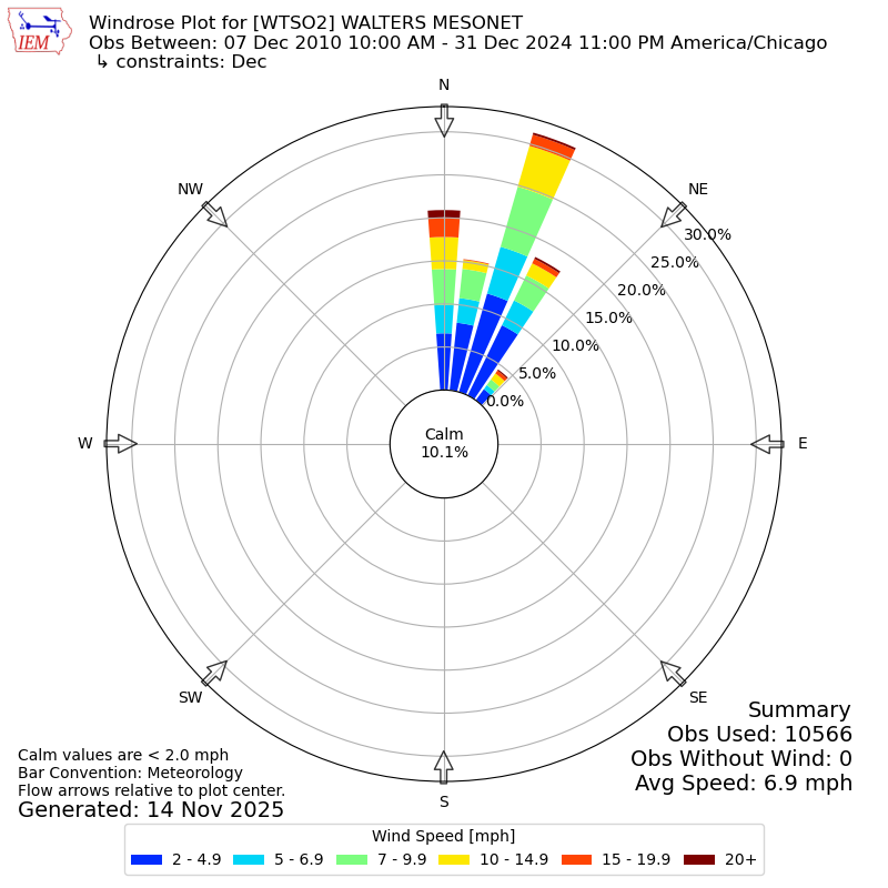The IEM has generated these wind roses based on our archive. The archive does contain errors and non-representative data, so please use care when using these plots. In general, data from airports is of good quality and representative of the local surrounding area.