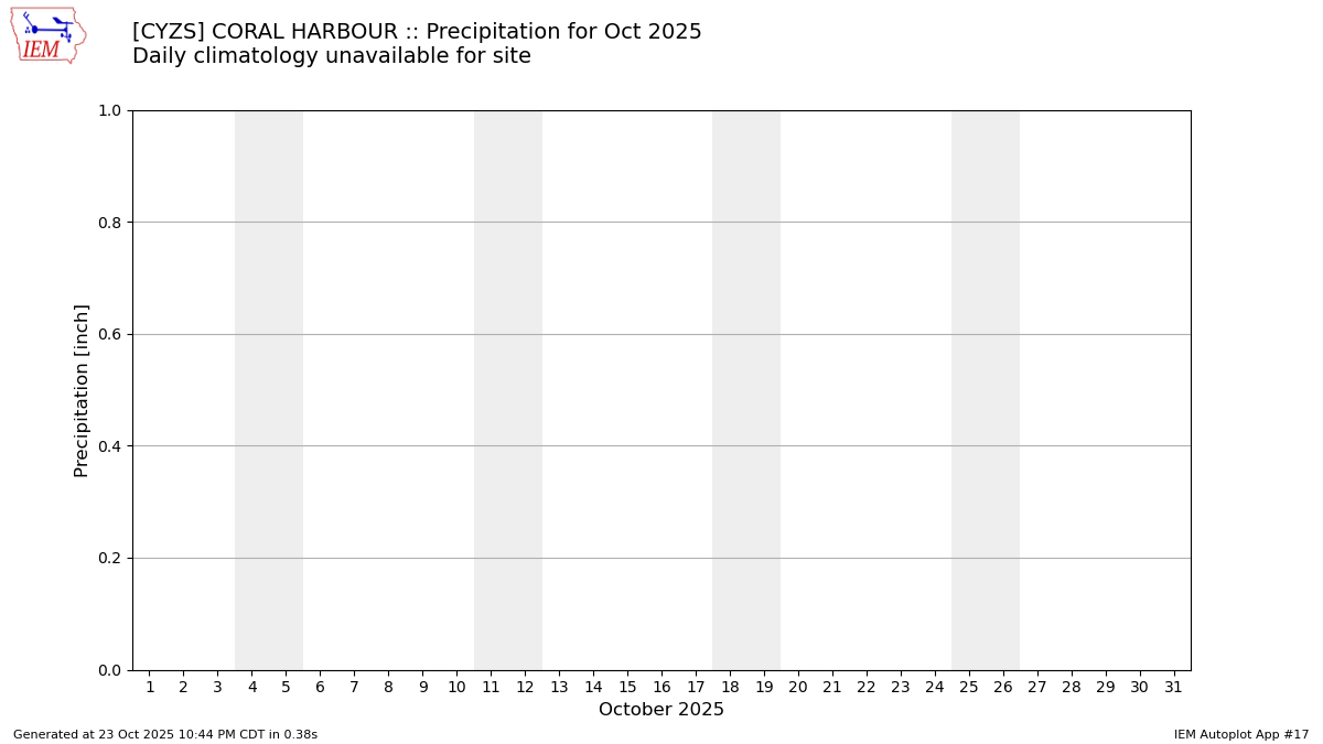 Description: This chart is of daily precipitation for the month. The red line would be an average month while the blue line and bars are observations.