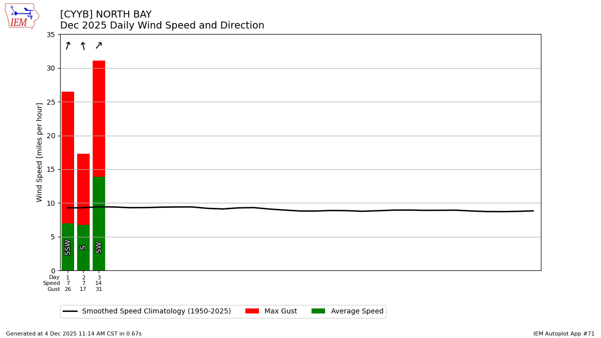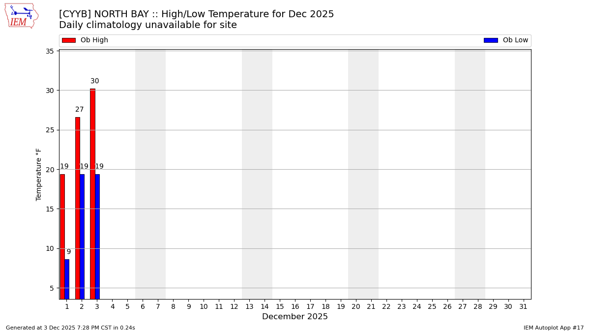 | 30 | 01 High: 19.4 Low: 8.6 Precip: M Avg Wind: SSW @ 7.0 Gust: SSE @ 26 (12:00 AM) RH% Min/Max: 62-93 Feel Min/Max: -7 to 10 | 02 High: 26.6 Low: 19.4 Precip: M Avg Wind: S @ 6.7 Gust: S @ 17 (5:46 AM) RH% Min/Max: 80-100 Feel Min/Max: 8 to 25 | 03 High: 30.2 Low: 24.8 Precip: M Gust: SSW @ 28 (12:00 PM) RH% Min/Max: 86-100 Feel Min/Max: 16 to 19 | 04 Precip: M | 05 | 06 |