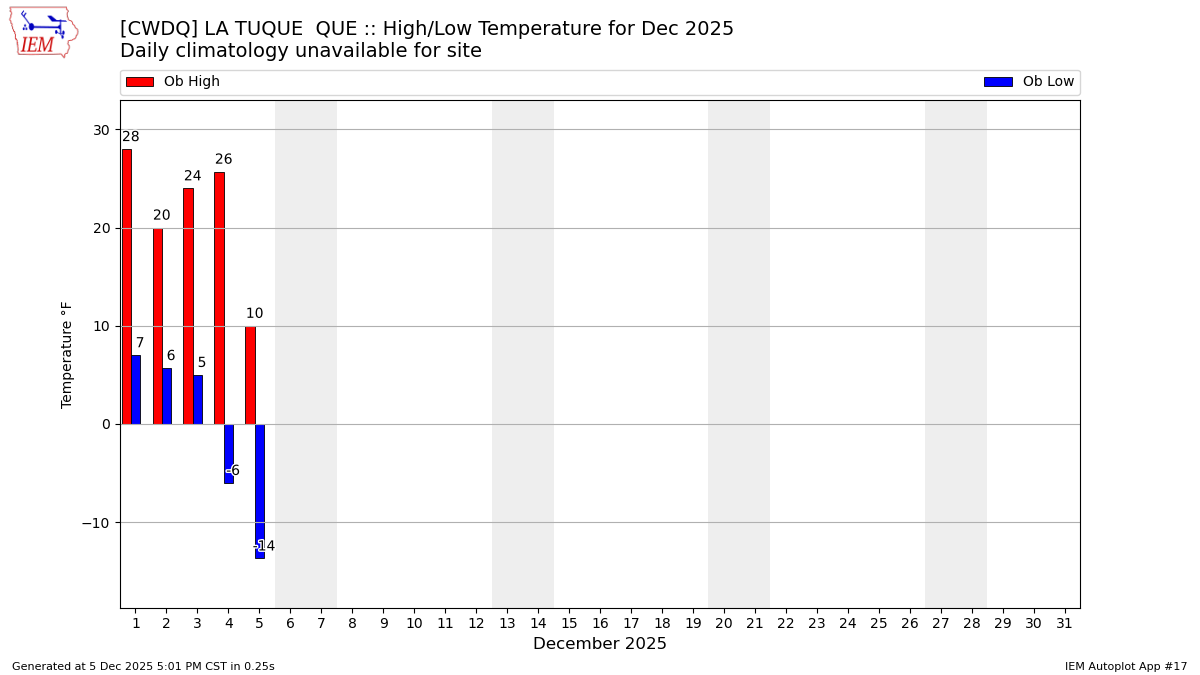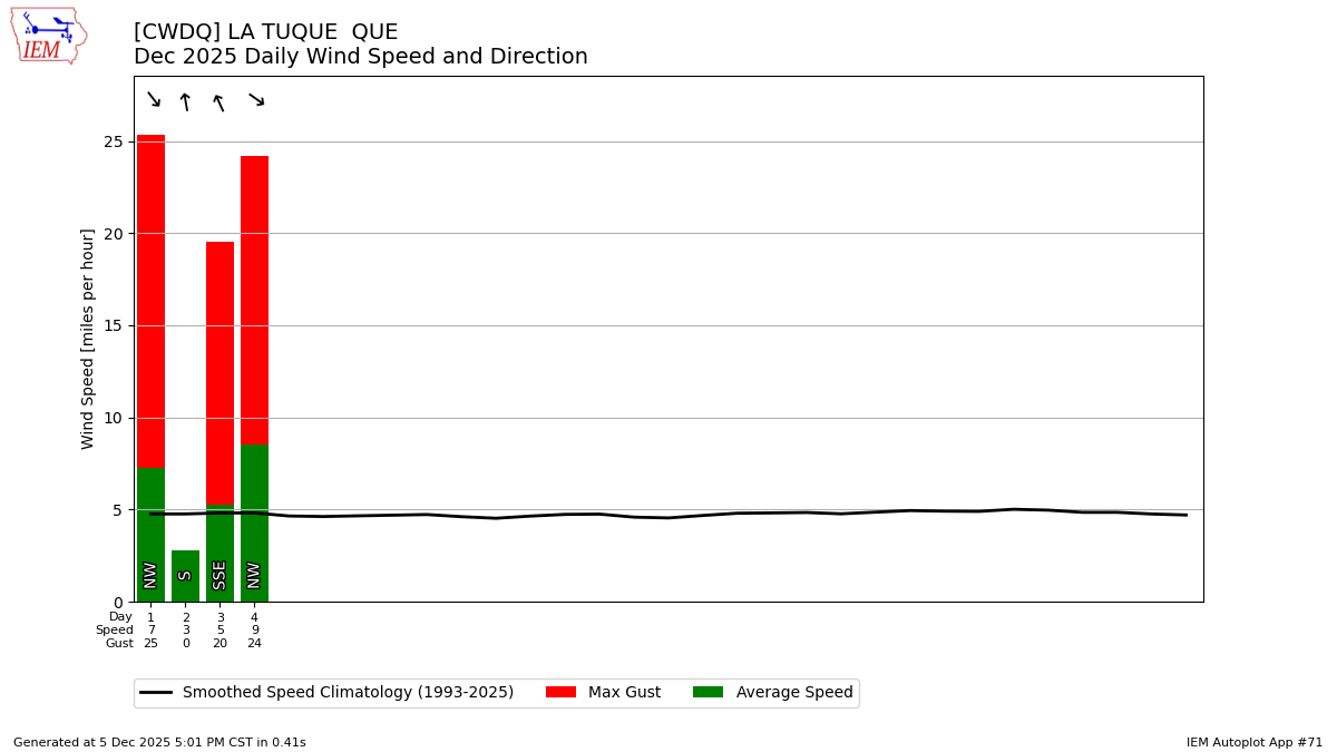 | 30 | 01 High: 28 Low: 7 Precip: 0.05 Avg Wind: NW @ 7.3 Gust: WNW @ 25 (5:45 AM) RH% Min/Max: 63-96 Feel Min/Max: -0 to 28 | 02 High: 20 Low: 5.7 Precip: 0.04 Avg Wind: S @ 2.8 RH% Min/Max: 65-94 Feel Min/Max: 2 to 15 | 03 High: 24 Low: 5 Precip: Trace Avg Wind: SSE @ 5.3 Gust: SSE @ 20 (6:15 PM) RH% Min/Max: 76-92 Feel Min/Max: 5 to 15 | 04 High: 25.7 Low: -6 Precip: Trace Avg Wind: NW @ 8.5 Gust: E @ 24 (9:42 AM) RH% Min/Max: 46-90 Feel Min/Max: -18 to 20 | 05 High: 10 Low: -13.7 Precip: M Gust: SSE @ 17 (11:00 AM) RH% Min/Max: 50-86 Feel Min/Max: -14 to -2 | 06 Precip: M |