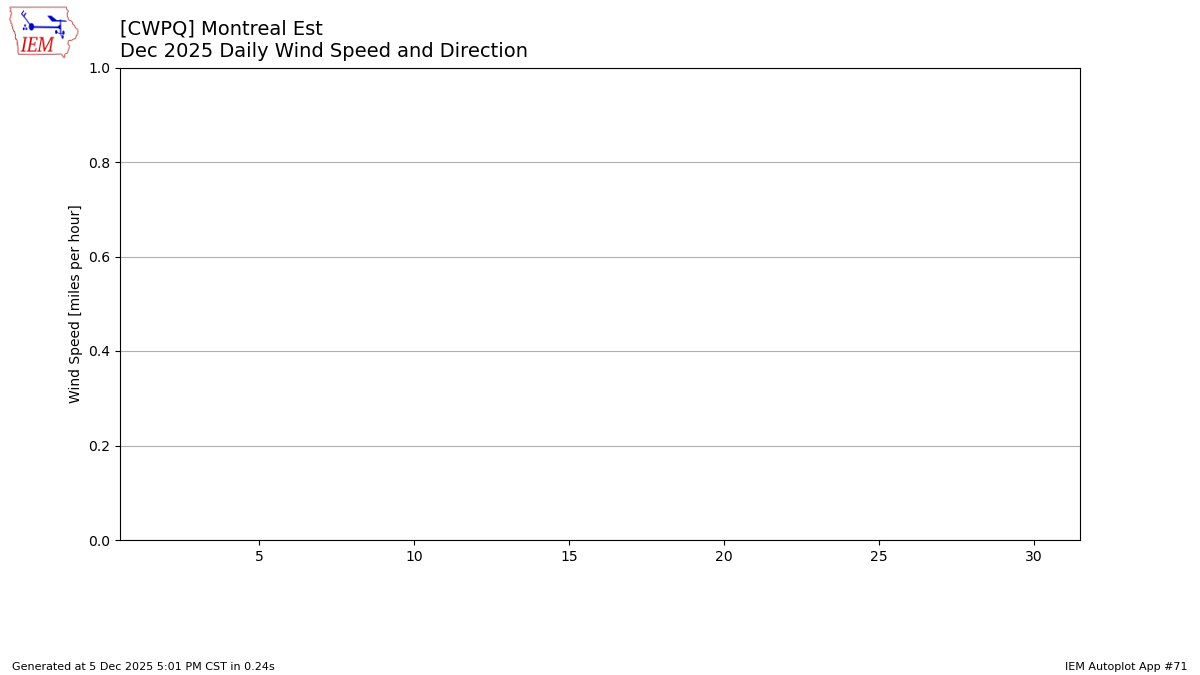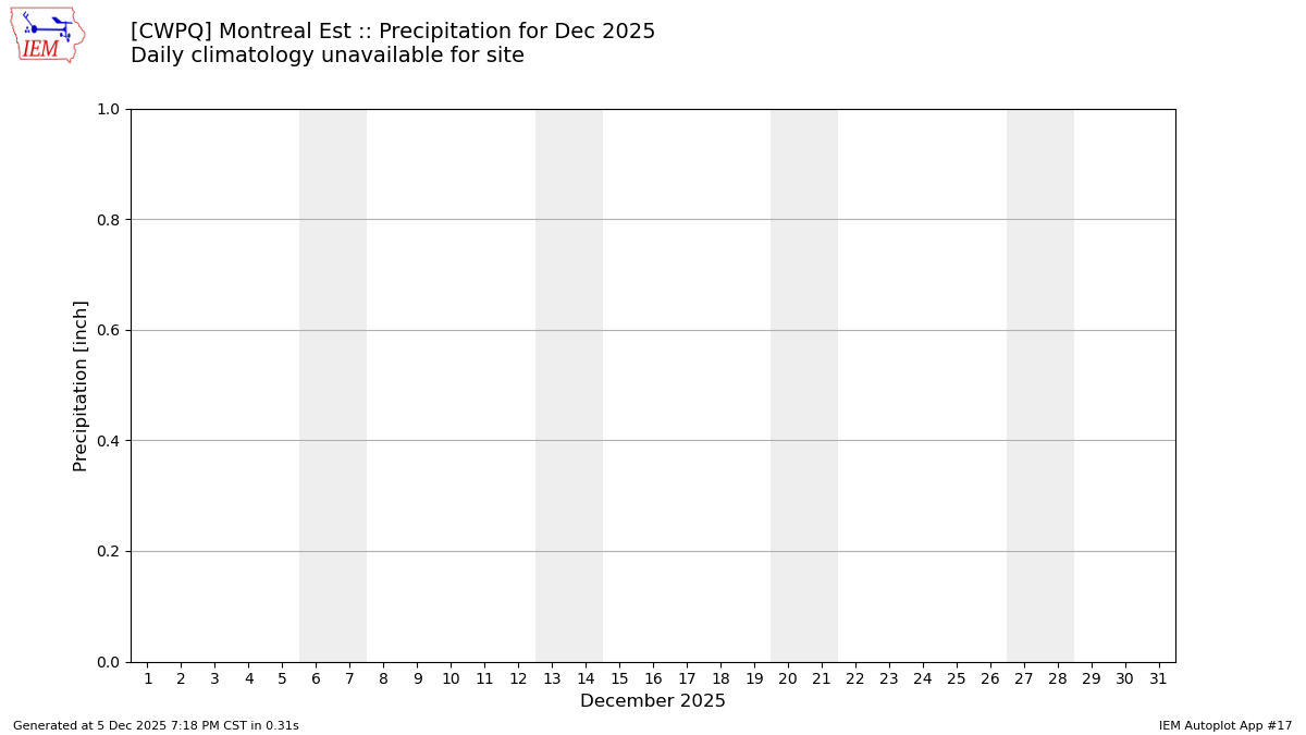 Description: This chart is of daily precipitation for the month. The red line would be an average month while the blue line and bars are observations.